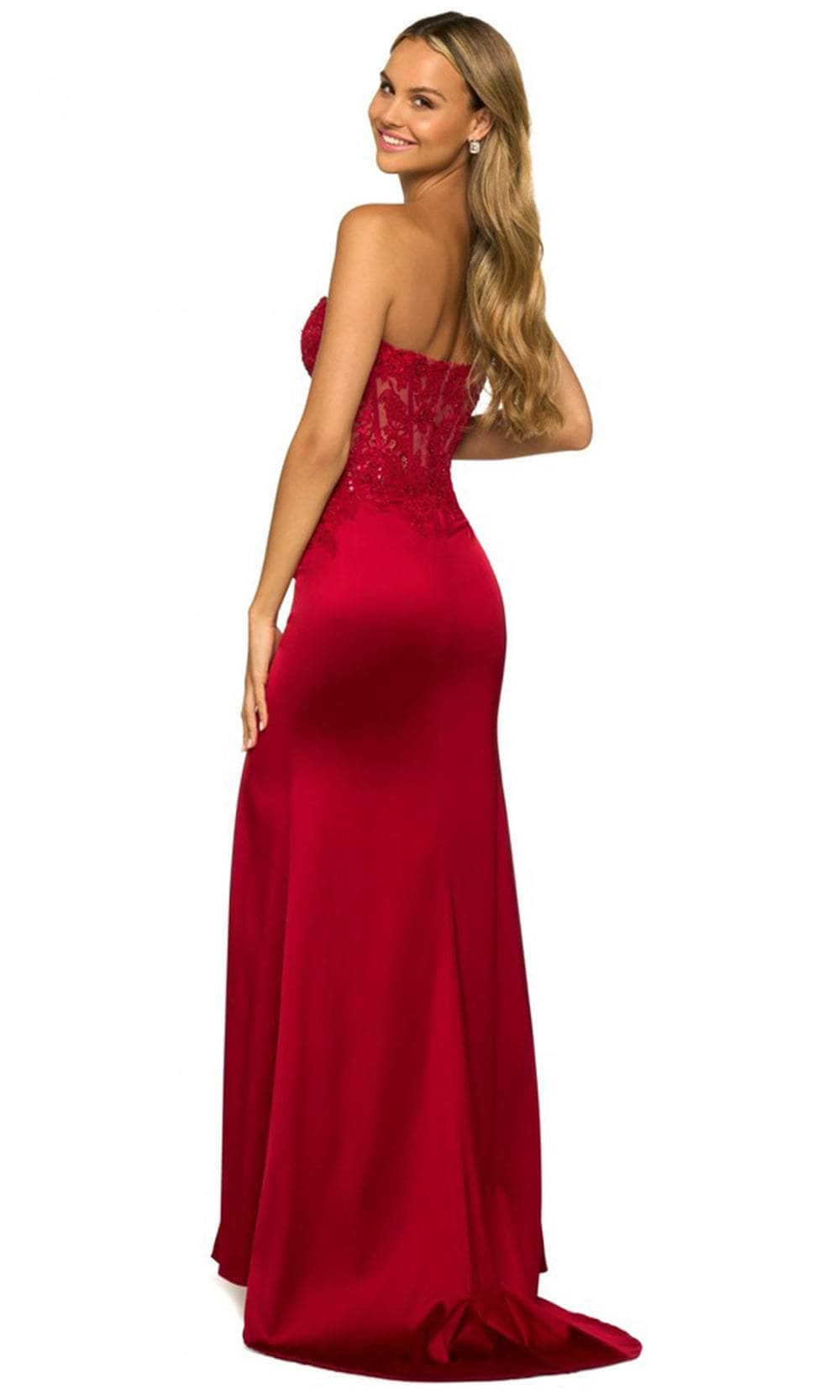 This charming Sherri Hill 55400 creation will captivate everyone. This corset-boned prom gown's feminine elegance is highlighted by a sweetheart neckline that is crowned on a strapless bodice adorned with lace applique. A mid-open back defines the form-fitting bodice. The skirt parades in a sheath silhouette and a slit in the side and a sweep train are added for a glamorous appearance. Sway to the music on your special event in this gorgeous gown from Sherri Hill 55400 masterpiece. Model is wearing Ruby color.