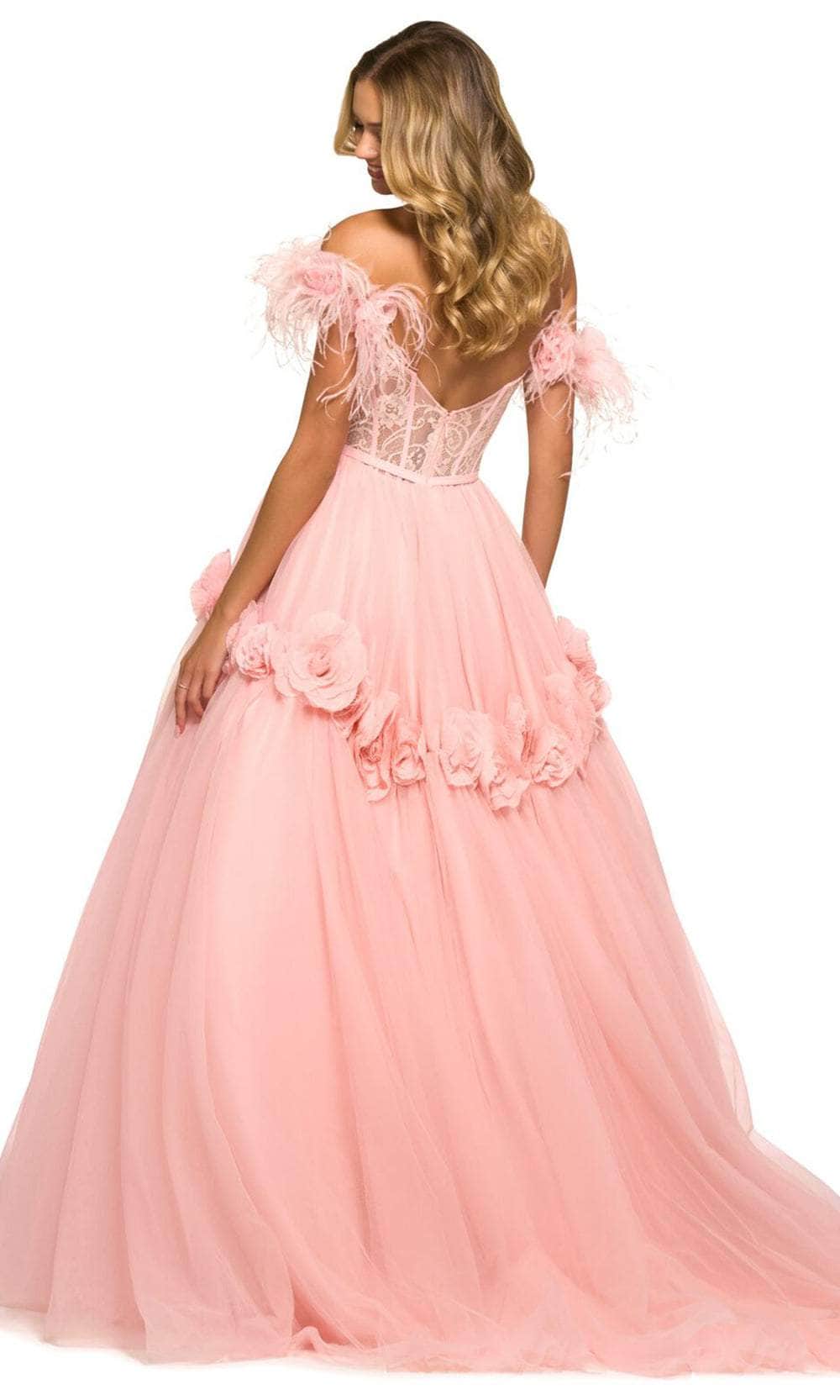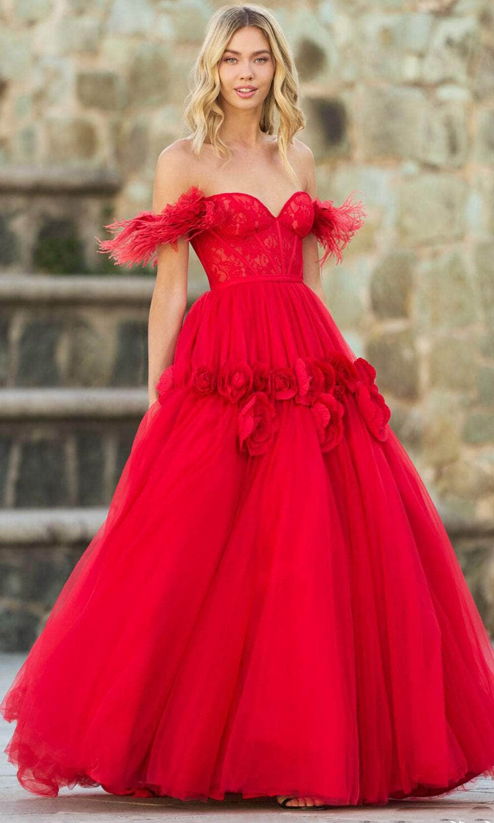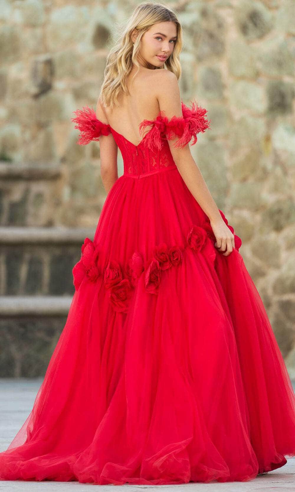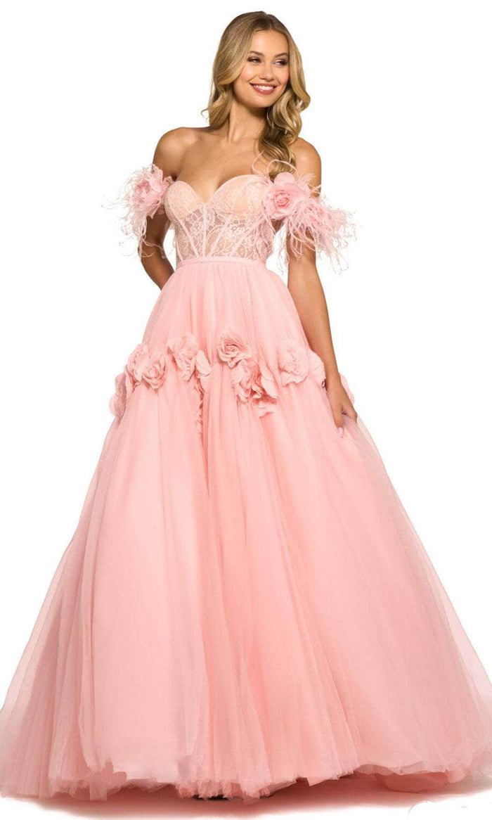 Be the lady of the night in this Sherri Hill 55429 Prom dress. An exquisite ballgown with a sweetheart neckline and short off-shoulder sleeves that are feathery for a whimsical accent. The sheer corset bodice is exquisitely adorned with delicate lace fabric, and it is matched by a full tulle skirt that is complemented by three-dimensional flowers. The back shows off a mid-open cut with a zipper at the center for a perfect fit. Leave everyone speechless when you enter the room in this Sherri Hill 55429 design. Models are wearing Blush, and Red colors.