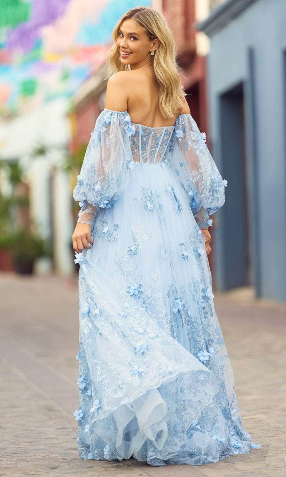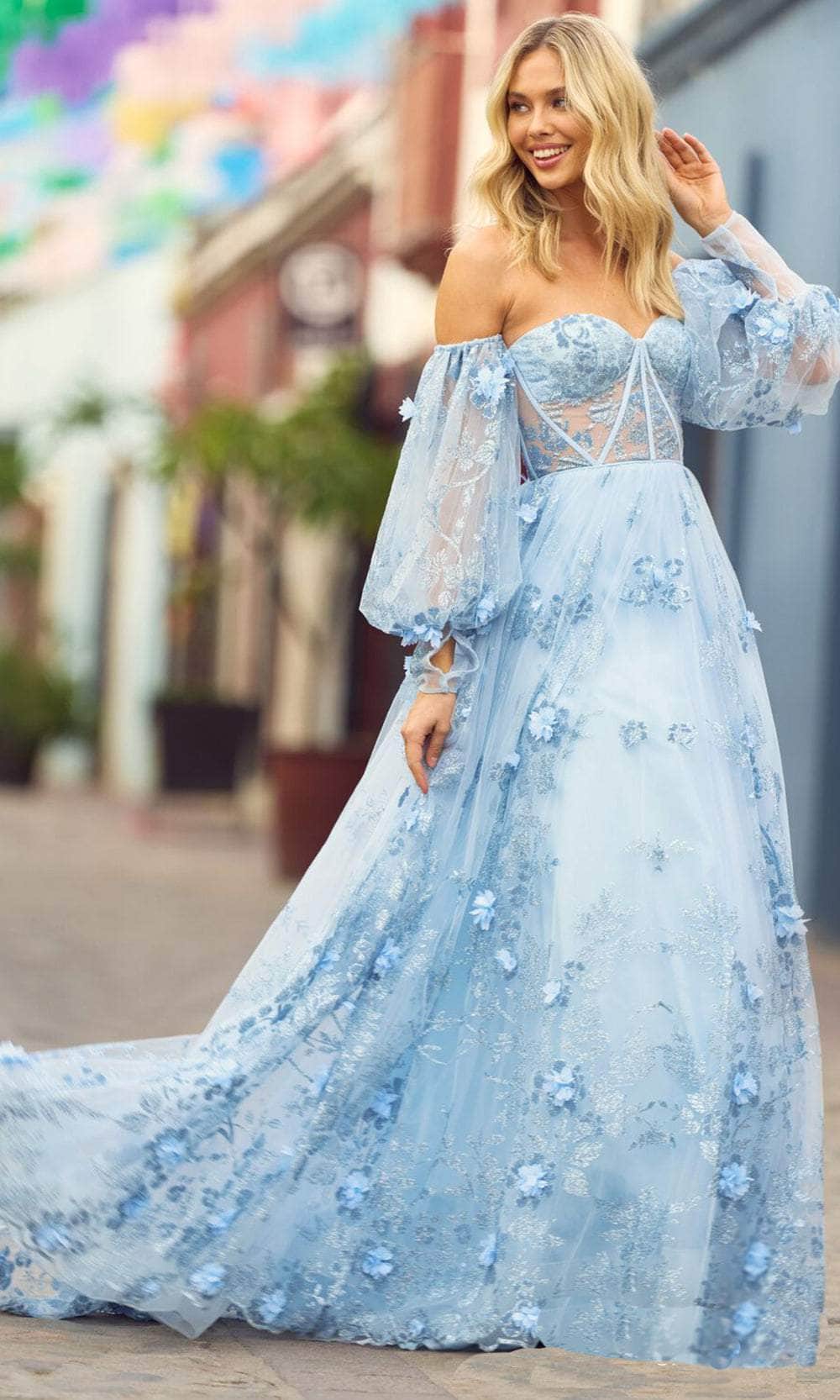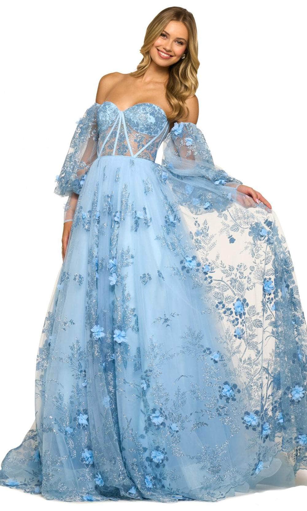 Get glamorous underneath the modern and classic detailing on this exquisite creation by Sherri Hill 55436. This dress showcases a corset fitted bodice beautifully designed with floral lace appliques framed with a strapless and sweetheart neckline with detachable off-shoulder bubble sleeves. The ballgown tulle skirt gorgeously falls to the floor, completed with a sweep train, while the back has a mid-open cut and center zipper closure. Flourish a fashionable style that will mesmerize the opulent crowd in this gorgeous Sherri Hill 55436 creation. Model is wearing Light Blue color.
