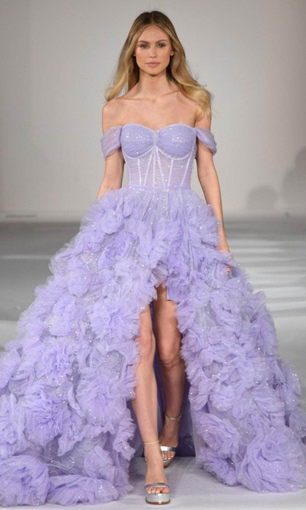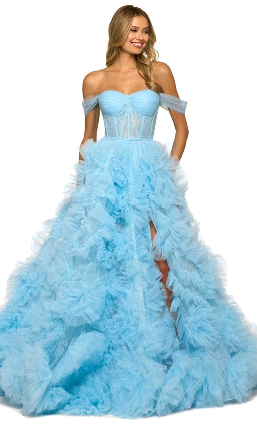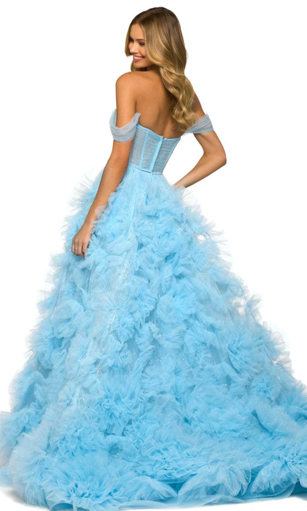 Express your unique persona and classic sophistication in Sherri Hill 55438 masterpiece. Beautifully detailed with glimmering embellishments that make you sparkle inside and out and will make you feel like a star. This fabulous dress features off-shoulder sleeves and a corset bodice. The back is secured with a zipper closure. The ruffled skirt is gorgeously accented with a slit and ends with a train. Shine with the glow of ever after in this mesmerizingly Sherri Hill 55438 creation. Model are wearing Light blue and Lilac colors.