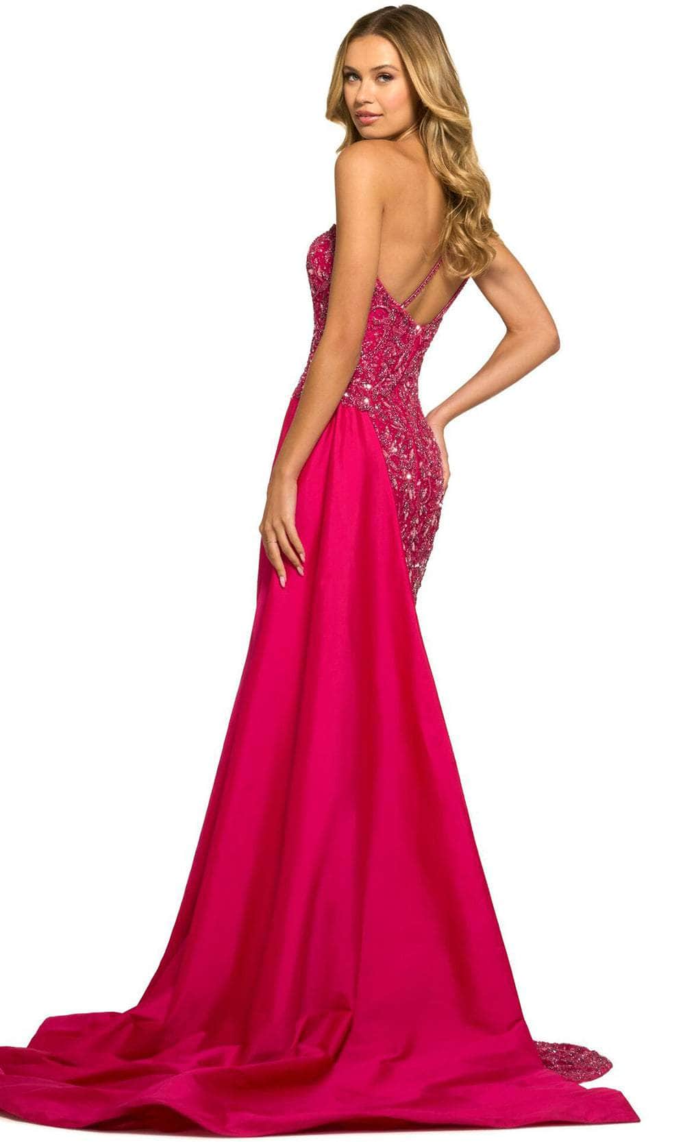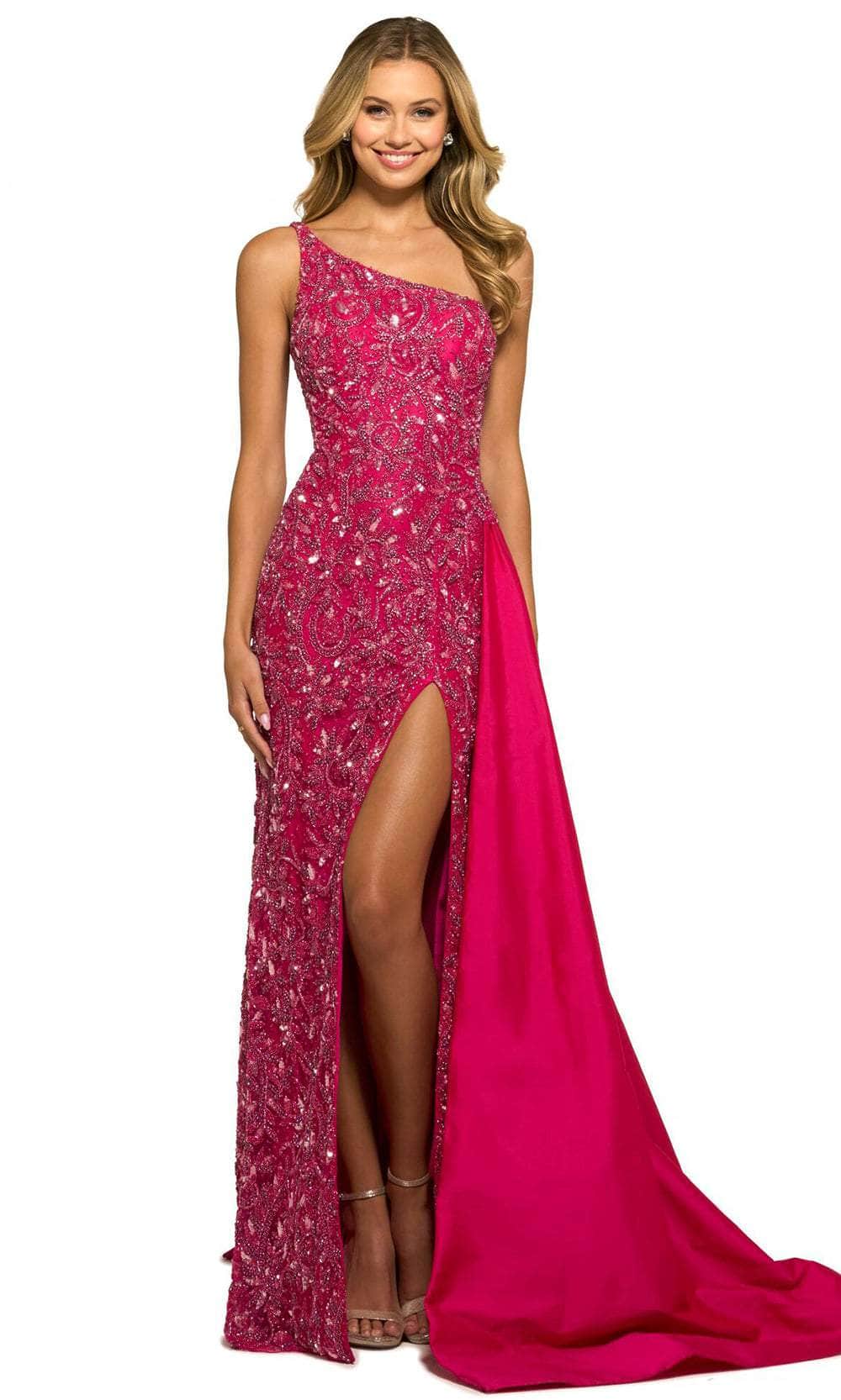 Appear like a modern princess with the unique beadwork of this Sherri Hill 55450. Striking in an asymmetrical style, this floor length gown stuns in a one-shoulder neckline, contrasted with a bold side train. This phenomenal dress hugs the figure and highlights a svelte sheath silhouette adorned with exquisite beadwork. A thigh high slit adds a daring touch to the ensemble. You will undoubtedly stand out on every occasion wearing this Sherri Hill 55450 creation. Model is wearing Fuchsia color.