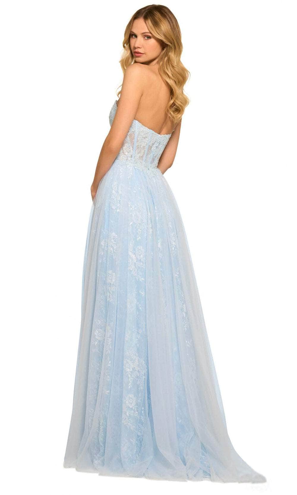 Embrace a wonderful evening in this spectacular gown from Sherri Hill 55489. With its semi-sweetheart neckline and strapless bodice, this dress is the definition of glitz and glamour. The fitted bodice is adorned with a shower of beaded lace and floral appliques supported by corset boning for a figure-flattering look. As it streams to the ground, the skirt displays a stunning A-line silhouette, while the sweep train and thigh high leg slit complete the look. This extravagant Prom gown by Sherri Hill 55489 is a red carpet knockout! Model is wearing Light Blue color.