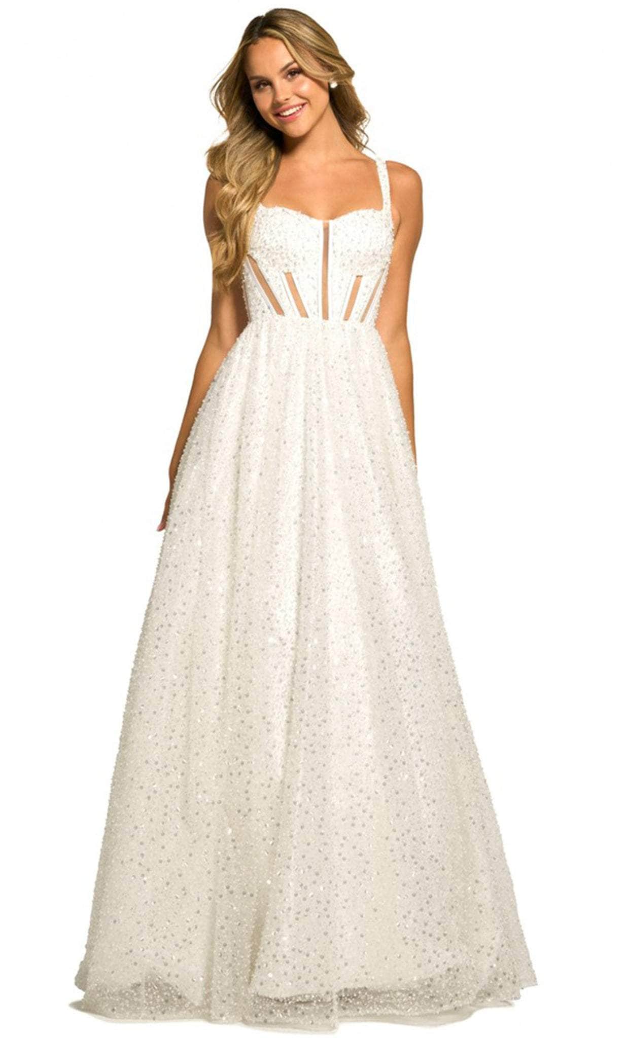 Get ready for everyone to stop and stare when you show up in this Sherri Hill 55530 dress. Under the event lights, the shimmering sequin will undoubtedly sparkle like diamonds. This sleeveless is stunning because it has a scoop neckline, and sheer illusion details and is perfectly paired with a mid-open back for added elegance. The skirt flares out to form a ballgown silhouette. Sherri Hill 55530 creates a fun and exciting look Model is wearing Ivory color.
