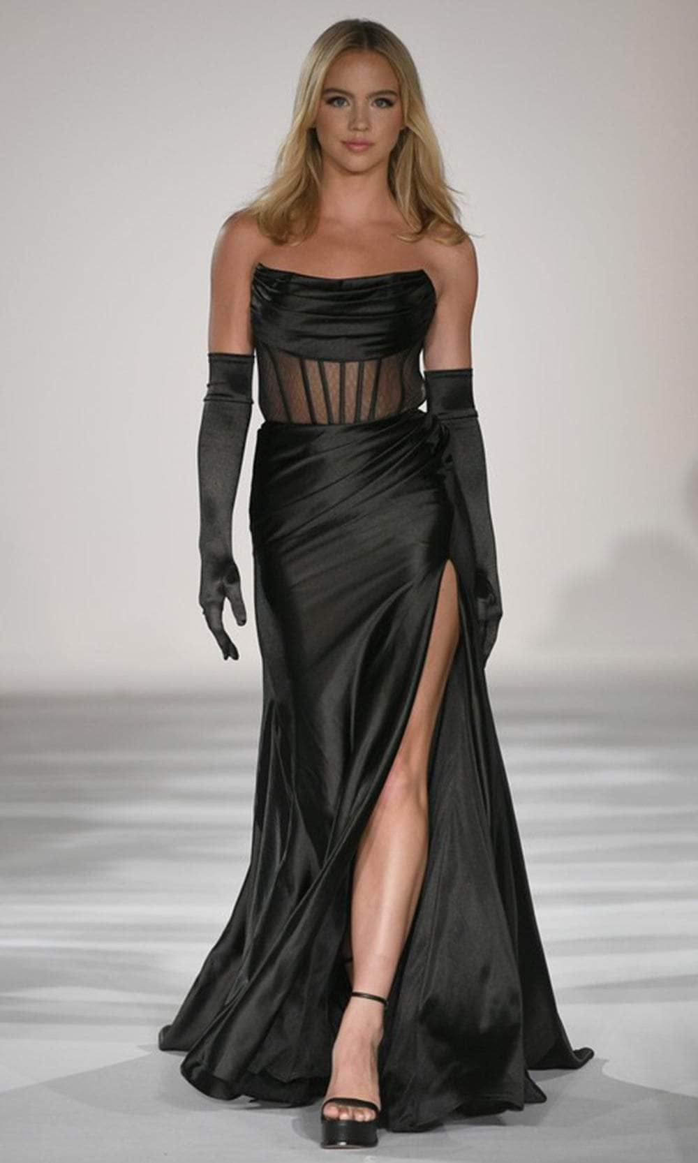 Details: Corset Bodice, Strapless, Ruched Skirt, Slit, Train, Back Zipper Closure