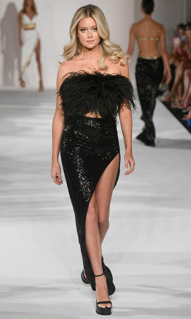 Show off your trendsetting style when you wear this shimmering Sherri Hill 55556 evening dress. This dress is tailored in shimmering sequin fabric and the top is embellished with feathers. Features a strapless design with a straight across neckline. The skirt has a hi low silhouette and is secured with a hidden back zipper. This Sherri Hill 55556 creation is sure to be an attention-grabber on any occasion. Models are wearing the Light Blue, Black, Ivory colors.