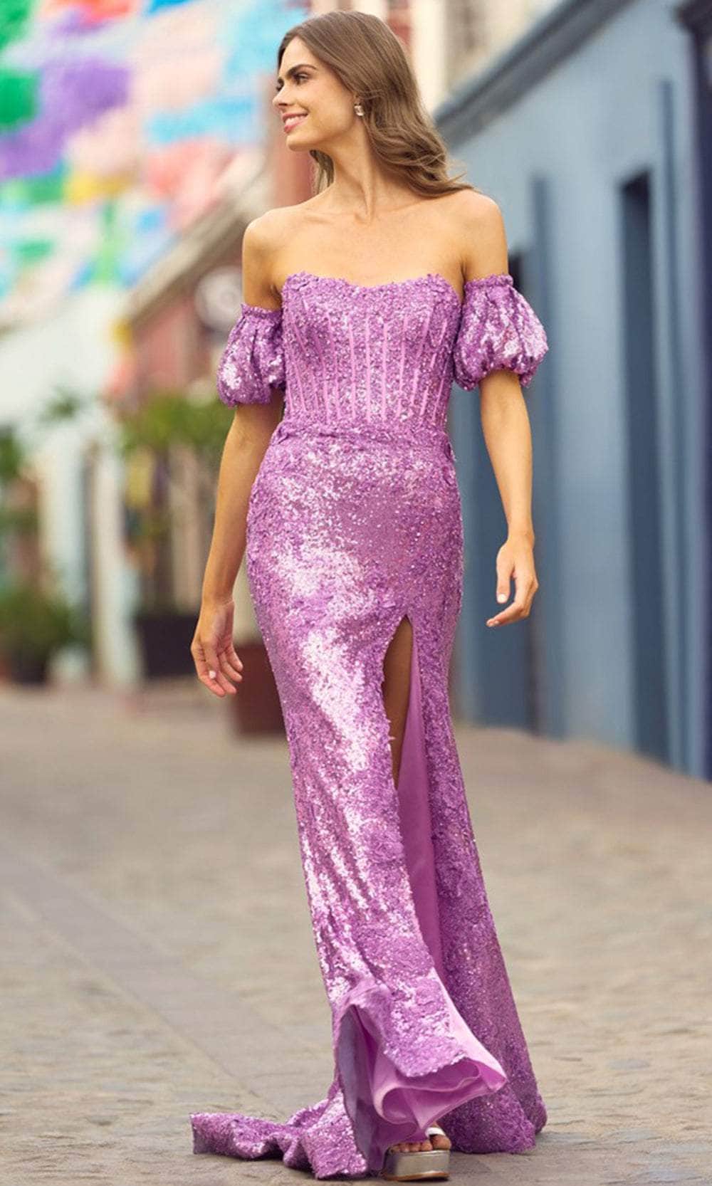 Be a ray of light in this glorious Sherri Hill 55608 creation. In this lovely shimmering gown, you will have an enchanting moment. Fully embellished with glittering sequins throughout this strapless gown, it has a scoop neckline. The skirt is accented with a high slit and parades in a sheath silhouette and trickles to a floor-length hem. A sweeping train is added for a glamorous look. This fabulous design by Sherri Hill 55608 brings a striking look meant to turn heads. Model is wearing Orchid color.