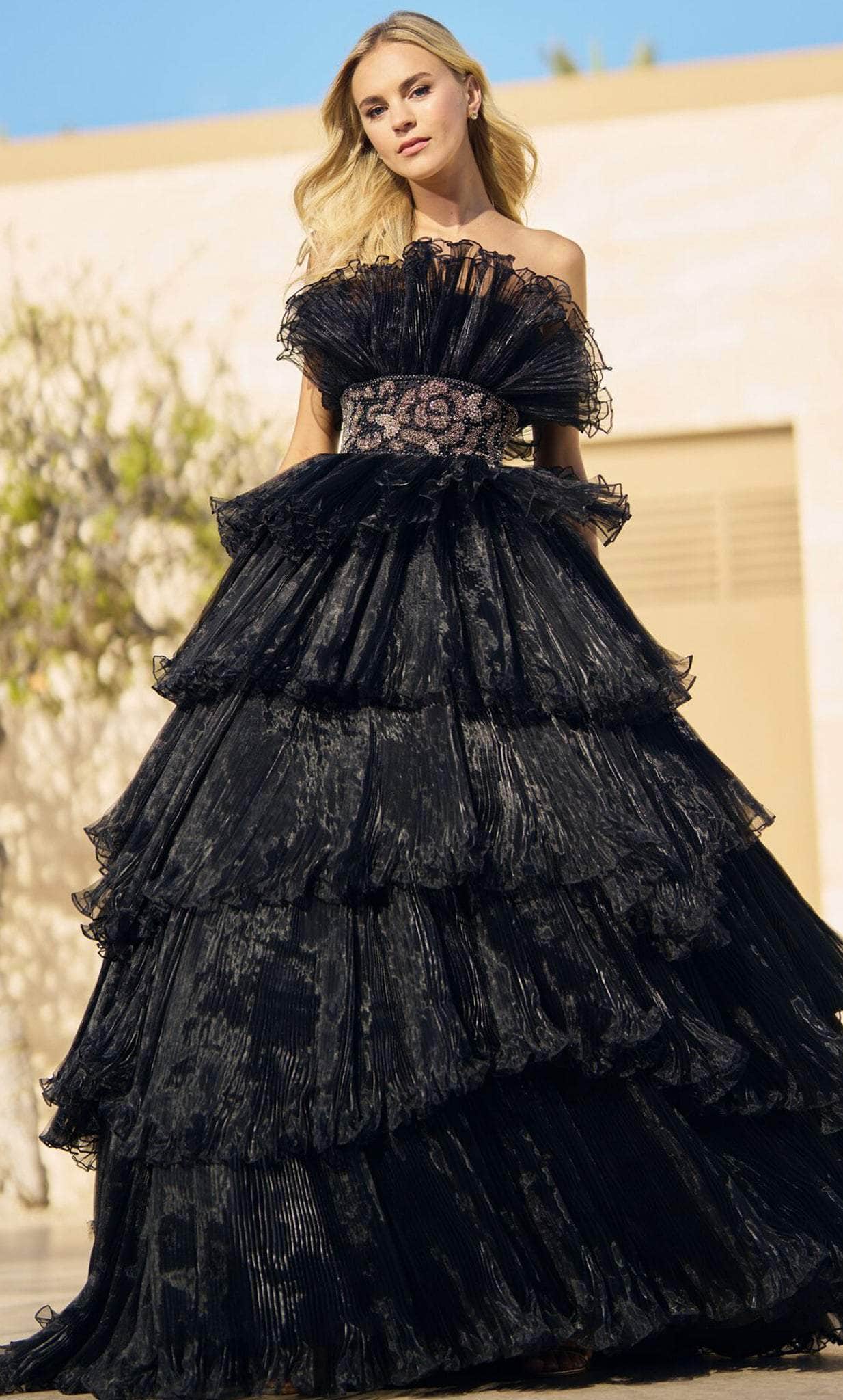 | Details: | Strapless, Embellished Waist, Ruffles, Tiered Skirt, Midrise Back, Sweep Train |