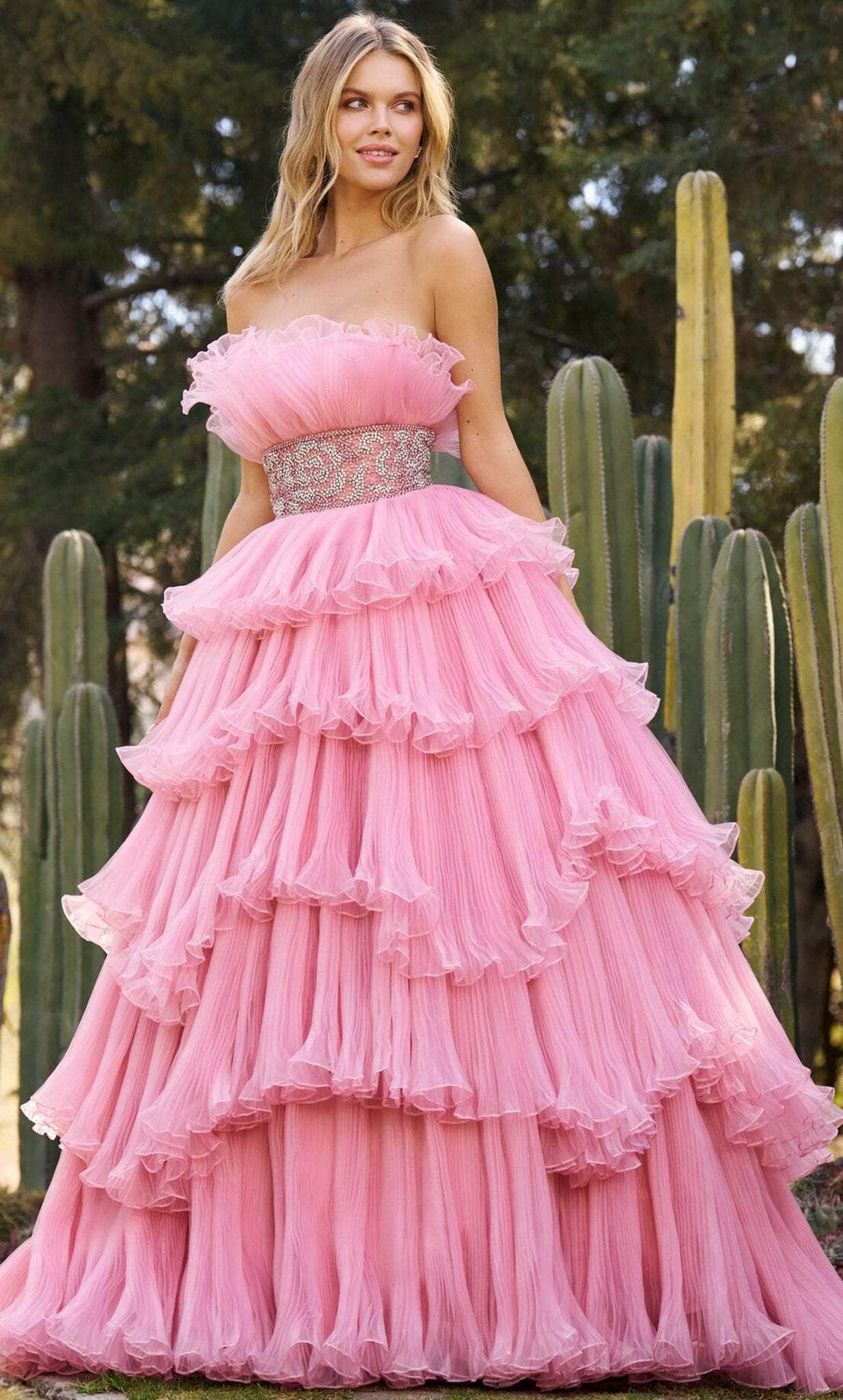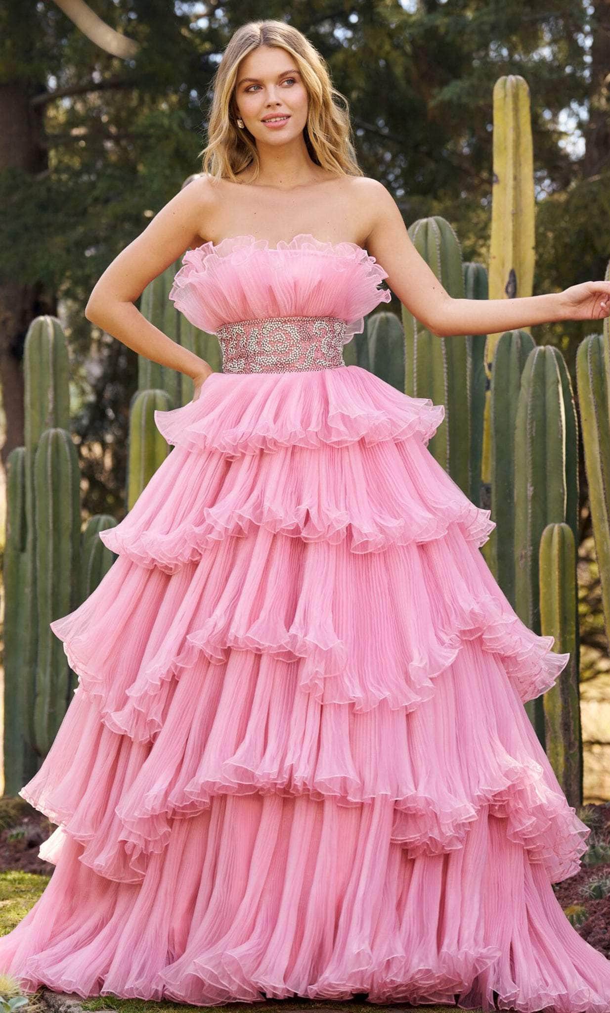 Glow with the magnificence of royalty in this inspired Sherri Hill 55635 creation. Sumptuously designed with ethereal layers textured with soft shirring and ending in curled hem, this impeccable piece reveals a straight-across neckline with a midrise back. Detailed with a crumbcatcher design and a bejeweled obi wrapping the waist, the voluminously layered skirt shows off tiers as it cascades into a ballgown design with a train. Be blessed with the stunning elegance of this immaculately styled Sherri Hill 55635 masterpiece. Models are wearing the Black and Candy Pink colors.