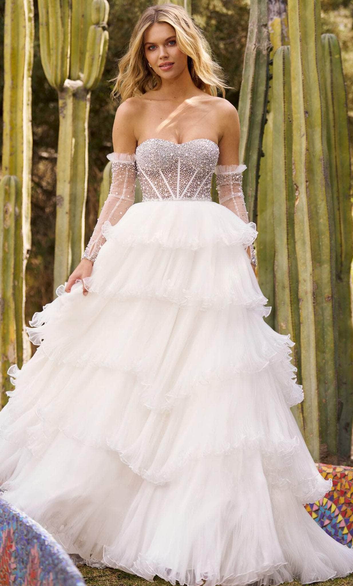 Make magic in this fantastic creation from Sherri Hill 55648. Showcasing a trendy illusion corset bodice adorned with pearls and rhinestones. This attention-grabbing strapless gown has a sweetheart neckline, open back, and glamorous detachable sheer long sleeves with playful feathers on top. Beautiful tiers of ruffled organza fabric make a voluminous ballgown skirt that pools into a sweeping train. Charm everyone with the ethereal flair of this Sherri Hill 55648 masterpiece. Model is wearing the Ivory color.