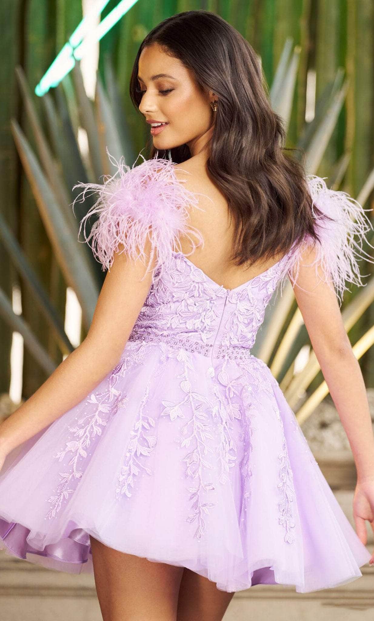 Bloom with loveliness in this detailed dress from Sherri Hill 55656. Showcasing a fit and flare bodice beautifully adorn with floral lace applique and sparkly beads, this look is a must-have. Feathers adorn the cap sleeves, accompanied by a plunging v-neckline, and a mid-open v-back. A dazzling rhinestone beaded belt emphasized the waist. A layer of tulle forms an A-line silhouette that trickles to the mid-thigh hemline. Feel dainty and feminine in this enchantingly designed Sherri Hill 55656. Model is wearing the Lilac color.