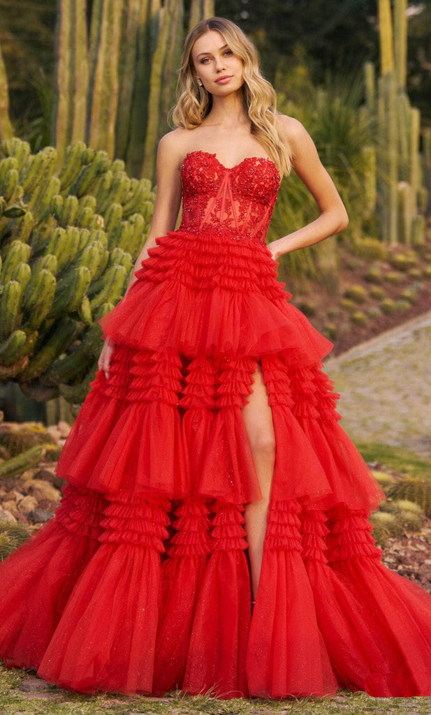 | Details: | Strapless, Beaded, Lace Appliques, Ruffled Tiers, High Slit, Midrise Back, Zipper Closure, Sweep Train |