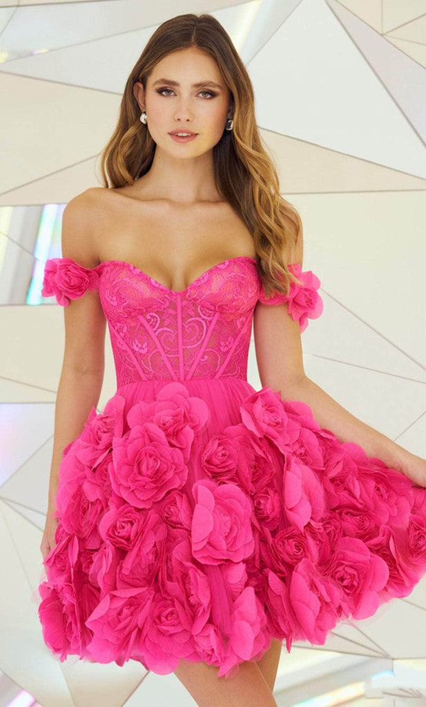 Sherri Hill 55717 exudes romance and femininity. This enchanting ensemble is an off-the-shoulder cocktail dress that showcases a lace corset top highlighting your figure, while delicate rose petal embellishments on the sleeves and skirt add a whimsical touch. The short-length skirt flows effortlessly in an A-line silhouette, allowing for graceful movement. With a back zipper closure, this dress ensures a secure and seamless fit. Step into the spotlight with confidence and charm in this stunning Sherri Hill 55717 creation that embraces elegance and grace. Model is wearing Bright Pink color.
