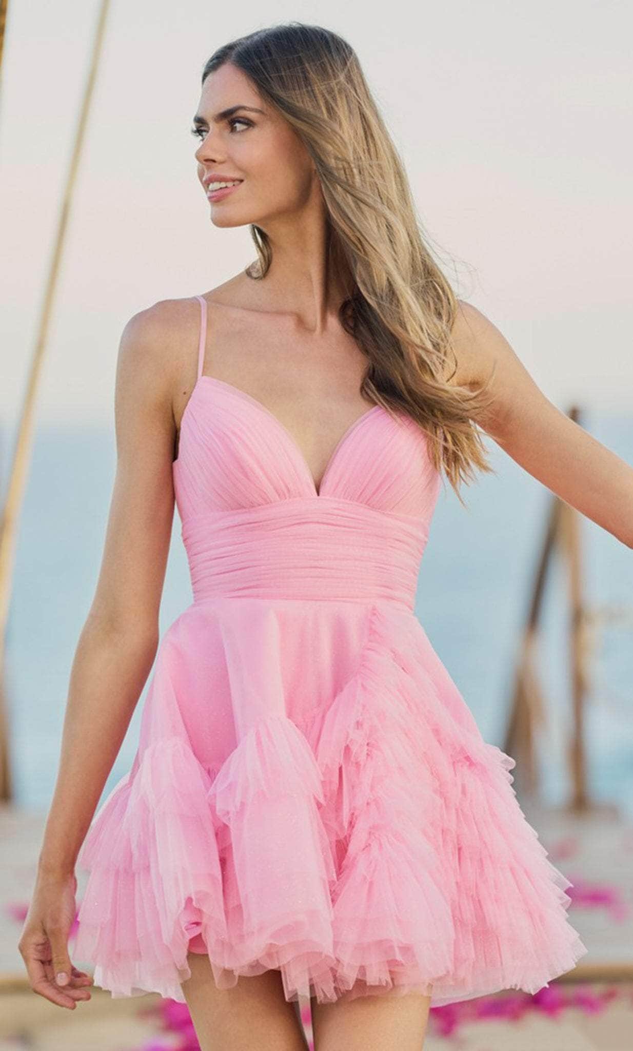 With Sherri Hill 55818, embrace the night in seductive elegance. With its unique combination of ruffle tulle, ruched bodice, and stunning open back, this dress is a true masterpiece. The spaghetti straps add a touch of delicacy, while the cummerbund enhances your waistline. Step into the spotlight with confidence, knowing that you are wearing a dress that will make heads turn and hearts skip a beat. Sherri Hill 55818 is your ticket to an unforgettable and enchanting evening. Model is wearing Hot Pink color.