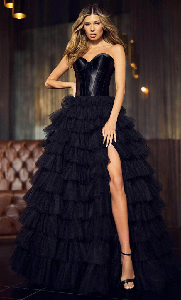 Appear in elegance in Sherri Hill 55928. This enchanting dress will leave everyone in awe. The sweetheart neckline and strapless design accentuate the décolletage, while the corset bodice cinches the waist, creating a captivating silhouette. Crafted from delicate organza, the A-line skirt flows gracefully, adorned with cascading ruffles that add movement and charm. The back zipper ensures a seamless fit, while the floor-length hemline and sweeping train add a touch of drama to this breathtaking gown. This Sherri Hill 55928 creation is simply breathtaking! Model is wearing Black color.