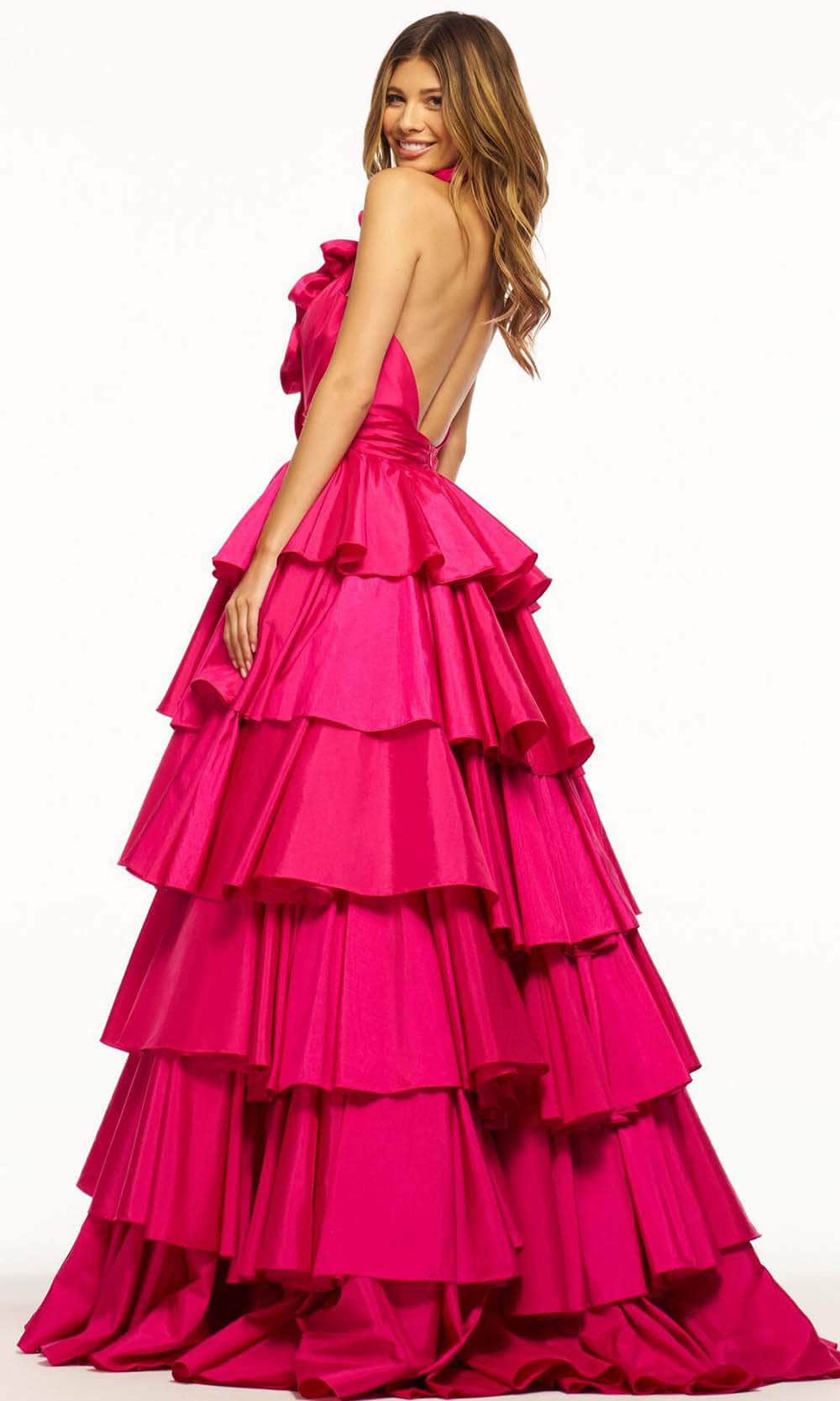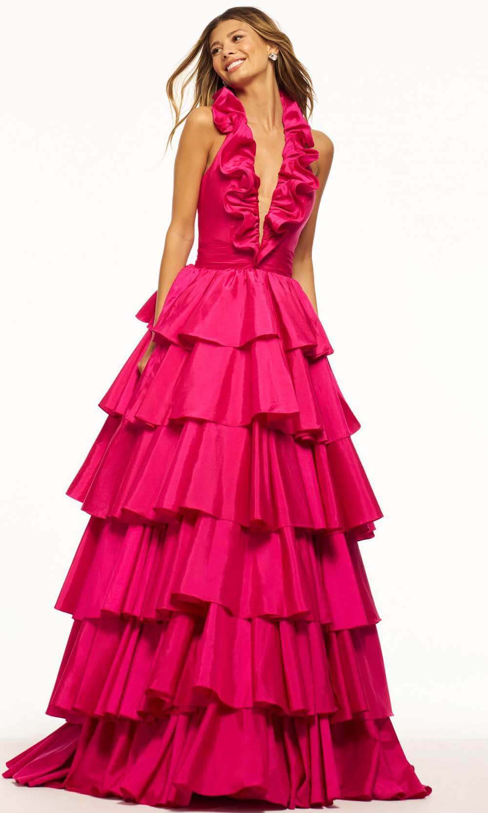 Make an unforgettable entrance in this stunning Sherri Hill 56013 gown, featuring a ruffle-trimmed plunging bodice that adds a touch of drama and style. The V-neckline and illusion inset provide a tasteful and alluring look. A low open back introduces a sense of sensuality and contemporary flair to the ensemble. The shirred waistband adds a subtle but appealing detail to the design. The tiered A-line skirt offers depth and movement, with a high slit for a modern edge. Completing the attire is a sweeping train, bringing a sense of refinement and sophistication to this beautifully crafted Sherri Hill 56013 gown. Models are wearing the Bright Fuchsia and Chartreuse colors.
