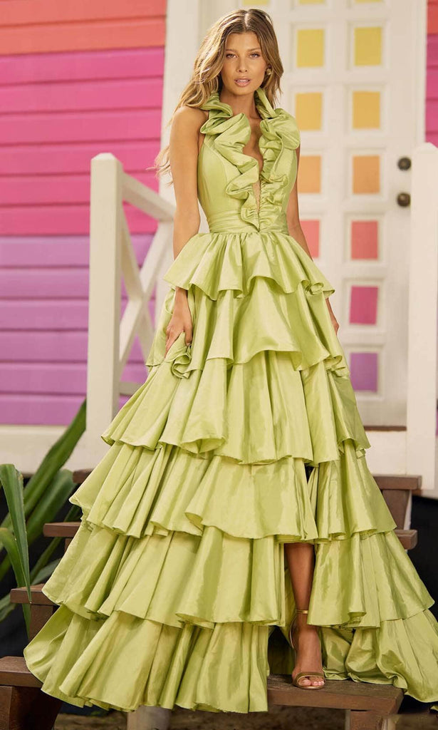Details: Ruffles, Plunging Bodice, Illusion Inset, Low Open Back, Shirred Waistband, Tiered A-Line Skirt with a High Slit, Sweep Train