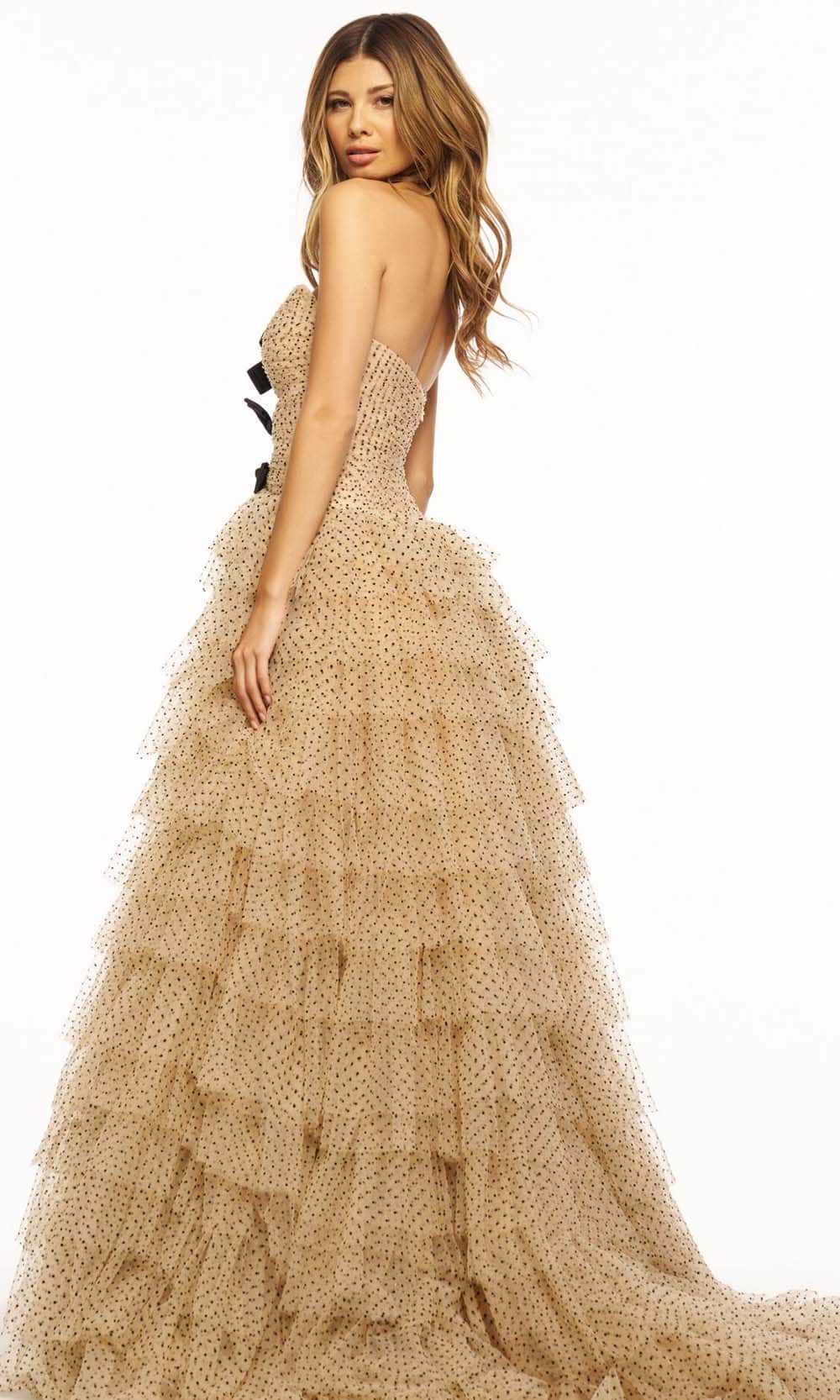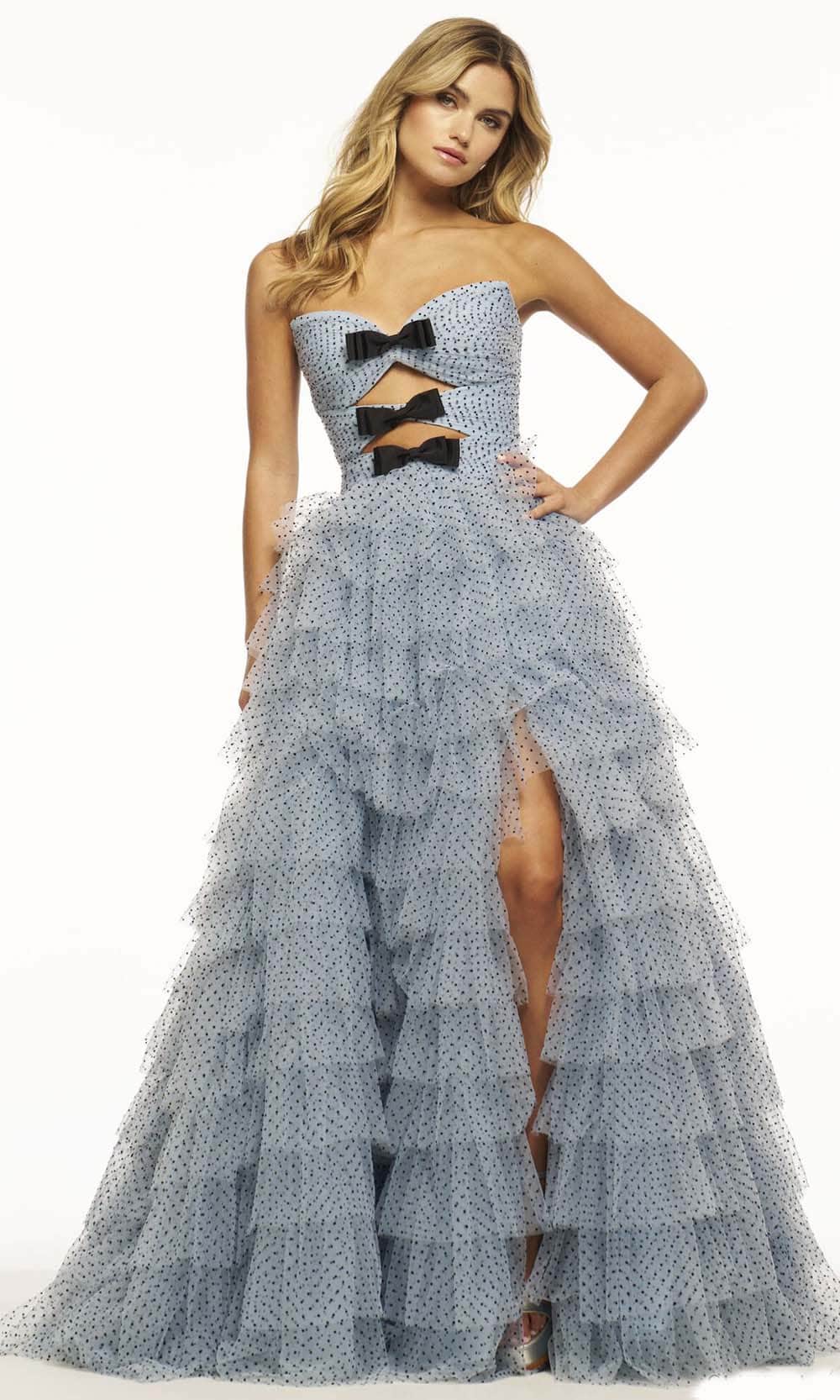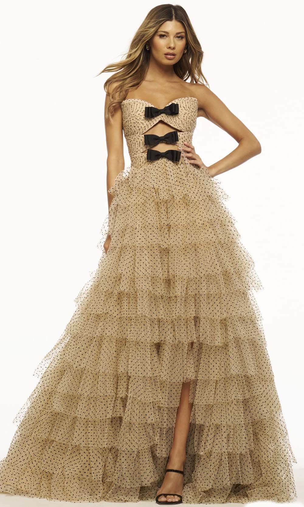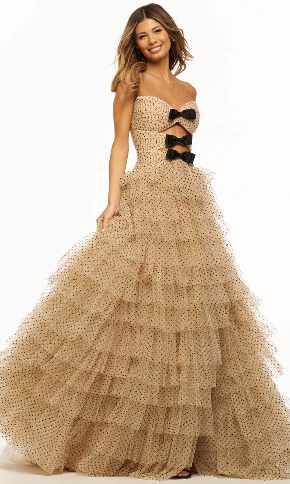 | Details: | Strapless, Polka Dot, Keyhole Cutouts with Bows, Midrise Back, Concealed Zipper Closure, Tiered Skirt, High Slit, Sweep Train |