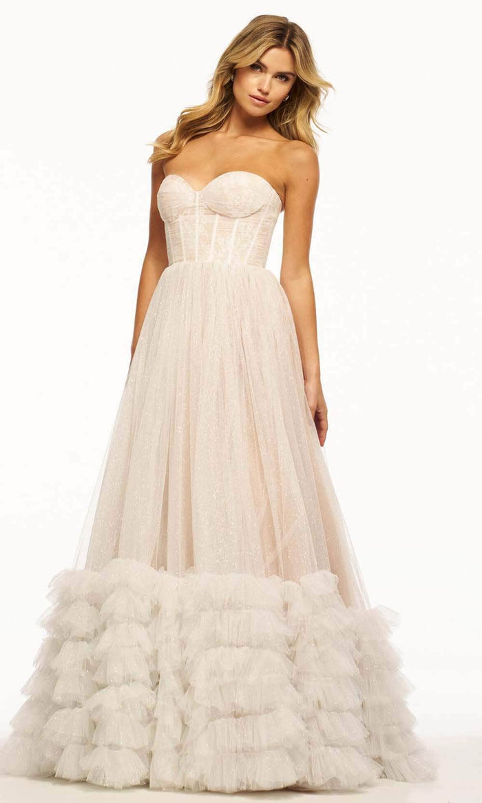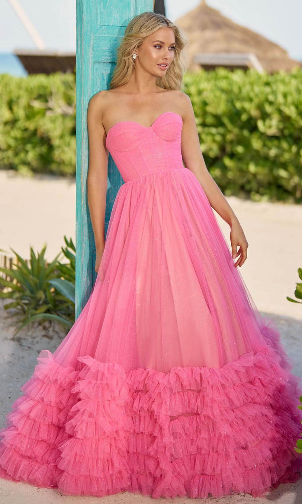 Exude charm and allure and be the star of the night in this Sherri Hill 56040 creation. This gown boasts a sleek strapless design with a shirred bustier for a structured look, enhanced by corset boning for support. The midrise back discreetly conceals a zipper closure, ensuring a seamless appearance. The ruffled hem adds a touch of charm, while the elegant sweep train completes the ensemble. With its understated features and thoughtful design, this Sherri Hill 56040 masterpiece is an ideal choice for any formal occasion. Models are wearing the Ivory/Nude and Bright Pink colors.