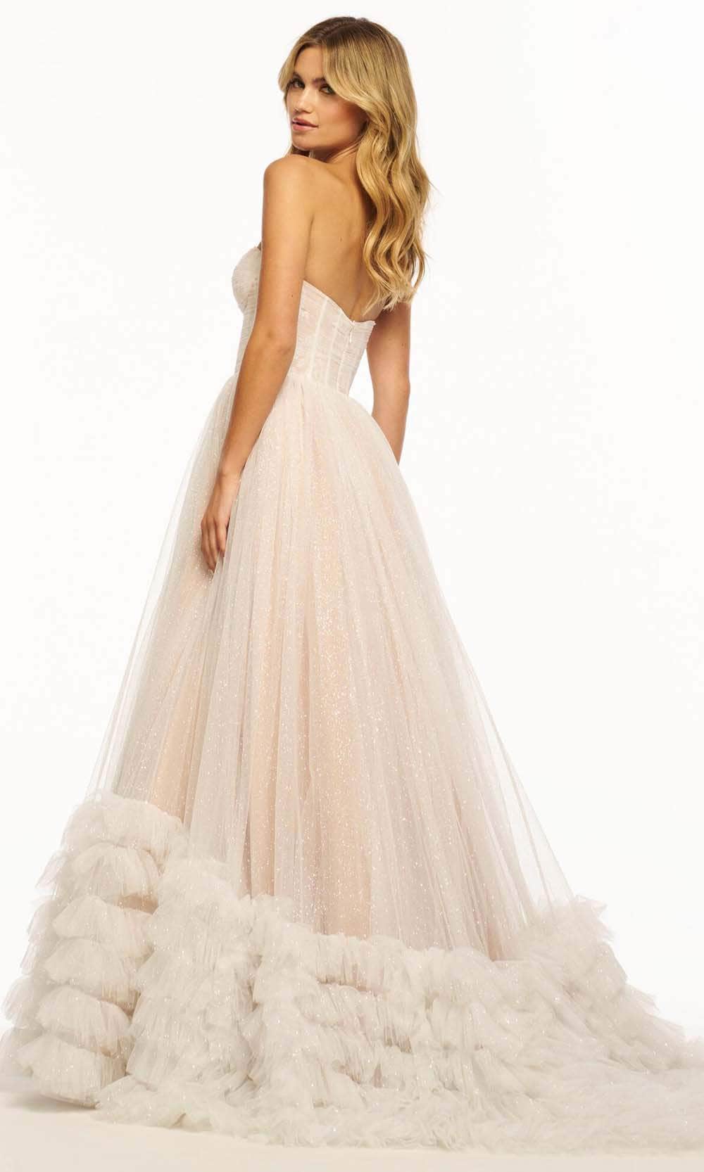 | Details: | Strapless, Shirred Bustier, Corset Boning, Midrise Back, Concealed Zipper Closure, Ruffled Hem, Sweep Train |
