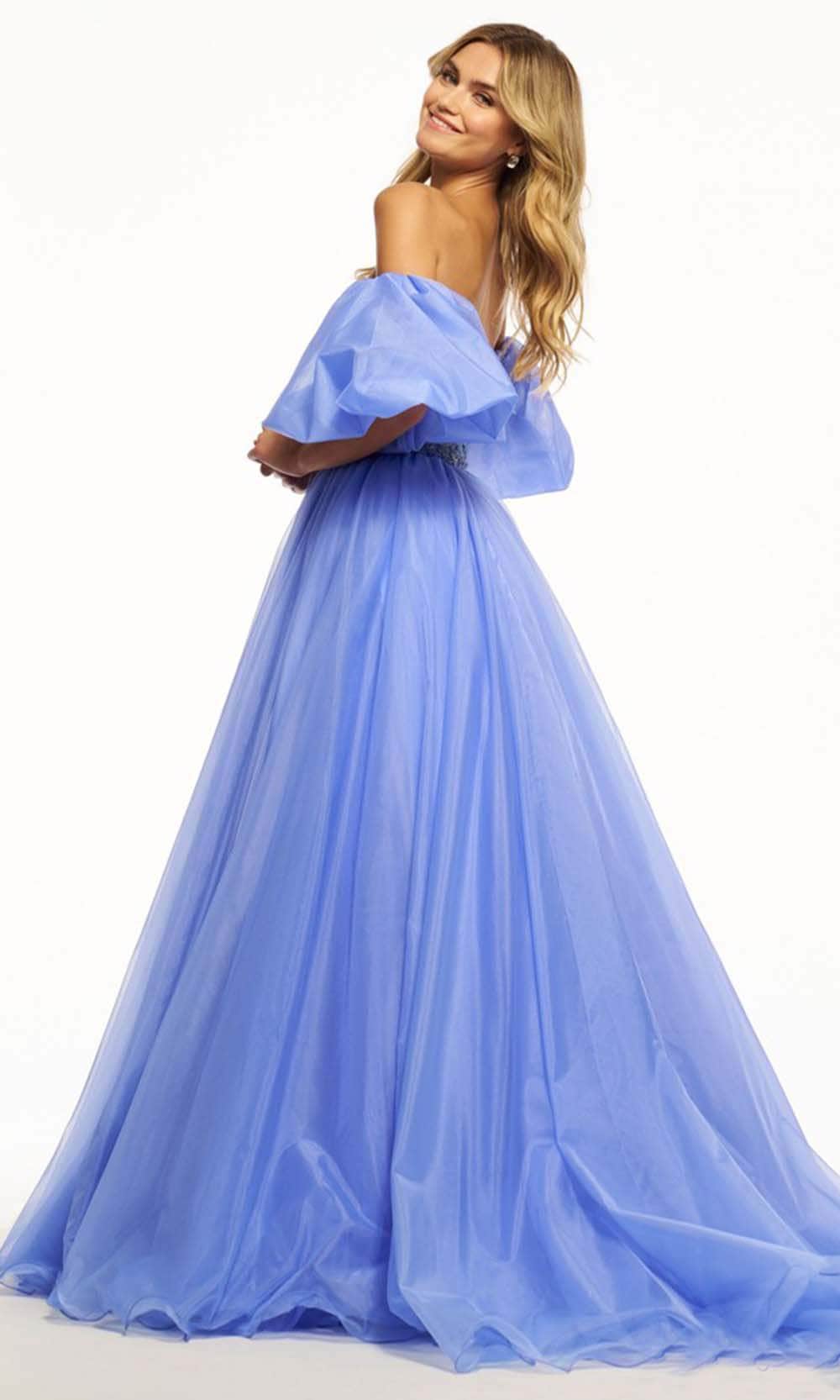 Experience the ethereal loveliness in this Sherri Hill 56052 masterpiece. Crafted from organza fabric, this style flaunts a straight-across off-shoulder neckline that beautifully draws attention to your collarbones and shoulders. The elbow-length puff sleeves add a whimsical touch, while the open back reveals just enough skin to leave a lasting impression. The upper bodice is embellished with intricate beadwork that gives a sparkle and elegance. The skirt cascades down, creating a mesmerizing voluminous ballgown silhouette, ending with a sweep train that exudes grandeur. Create magical moments as you revel in Sherri Hill 56052 gown. Model is wearing Periwinkle color.