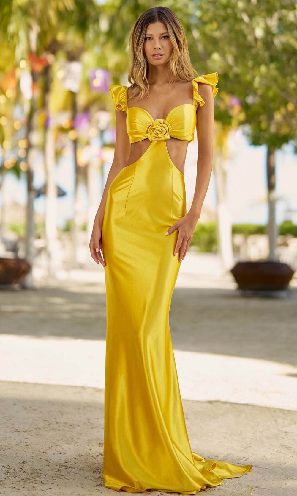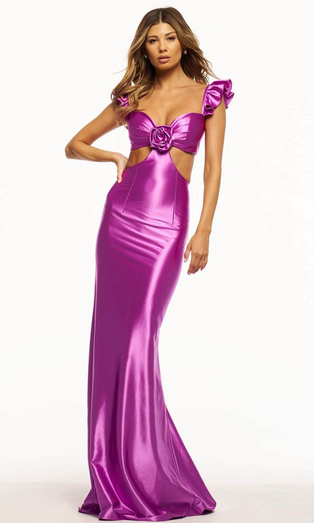 Experience modern elegance in this Sherri Hill 56056 gown crafted from silky stretch satin fabric. The ruffle straps add a subtle touch of whimsy, leading to a sweetheart neckline adorned with a rosette bust detail for a classic and charming appeal. Side midriff cutouts introduce a contemporary element, complemented by a tie bandeau strap, creating a stylish and cohesive look. The low open back adds a touch of allure, while the mermaid skirt gracefully follows the silhouette, concluding with a sweep train for a sophisticated and dynamic finish. Effortlessly embody timeless sophistication in this Sherri Hill 56056 masterpiece. Models are wearing the Yellow and Purple colors.