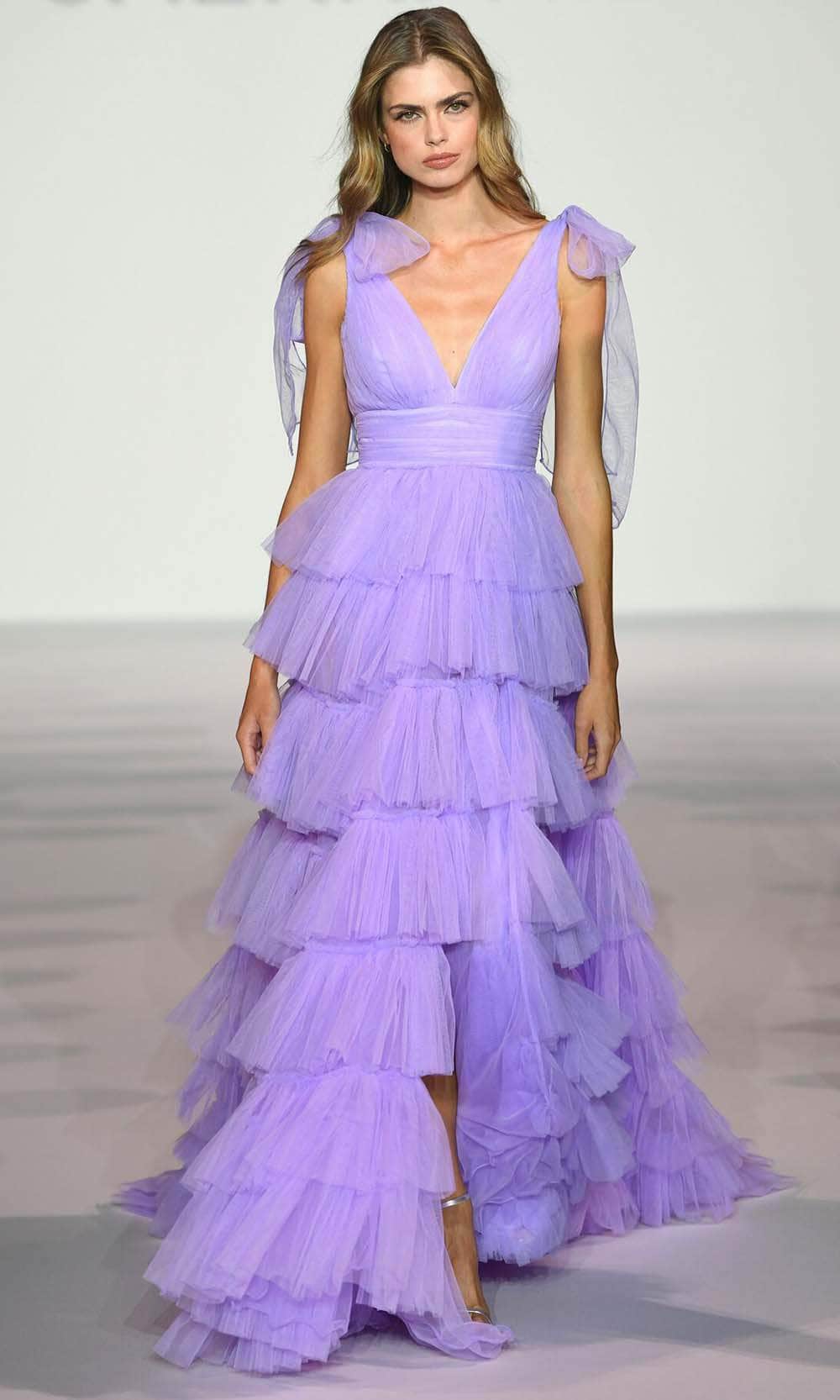 | Details: | Tulle Bows On Shoulder Sleeves, Shirred Bodice, Midrise Back, Concealed Zipper Closure, High Slit, Tiered Skirt, Sweep Train |