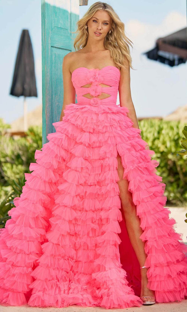 Be the center of attention and stand out from the crowd in this Sherri Hill 56067 creation. This gown offers a tastefully minimalist design with a strapless neckline and a shirred bodice, providing subtle texture and structure. Keyhole cutouts adorned with rosette embellishments add delicate detailing to the ensemble. The midrise back is neatly finished with a concealed zipper closure for a seamless look. A ruffle skirt gracefully falls from the waist, and a high slit adds an element of movement and flair. Completing the gown is a sweep train, adding a classic touch to this understated yet elegant attire. With its clean lines and thoughtful features, this Sherri Hill 56067 gown offers a timeless and comfortable choice for any formal occasion. Models are wearing the Black and Candy Pink colors.