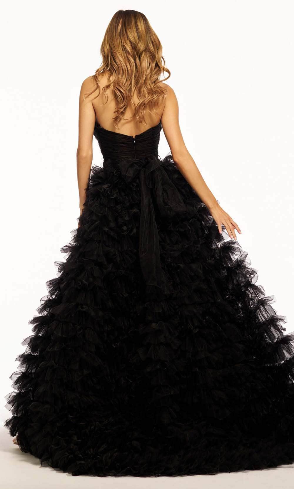 | Details: | Strapless, Shirred Bodice, Keyhole Cutouts with Rosette Embellishments, Midrise Back, Concealed Zipper Closure, Ruffle Skirt, High Slit, Sweep Train |