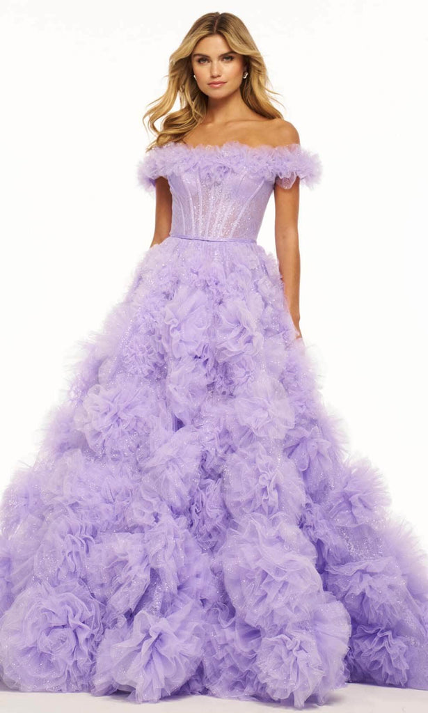 Capture a stunning look in photos wearing the exquisite Sherri Hill 56095 prom gown. This dress features a delightful ruffled off-shoulder neckline atop a boned bodice. The mid-open back, elegantly secured by a zipper, ensures a polished finish. With a beautifully ruffled A-line skirt in floral styles, the dress exudes charm. The addition of a court train gracefully cascading to floor length enhances its overall appeal. Radiate a captivating charm destined to captivate the elite crowd in this gorgeous Sherri Hill 56095 masterpiece! Models are wearing Purple, and Black colors.