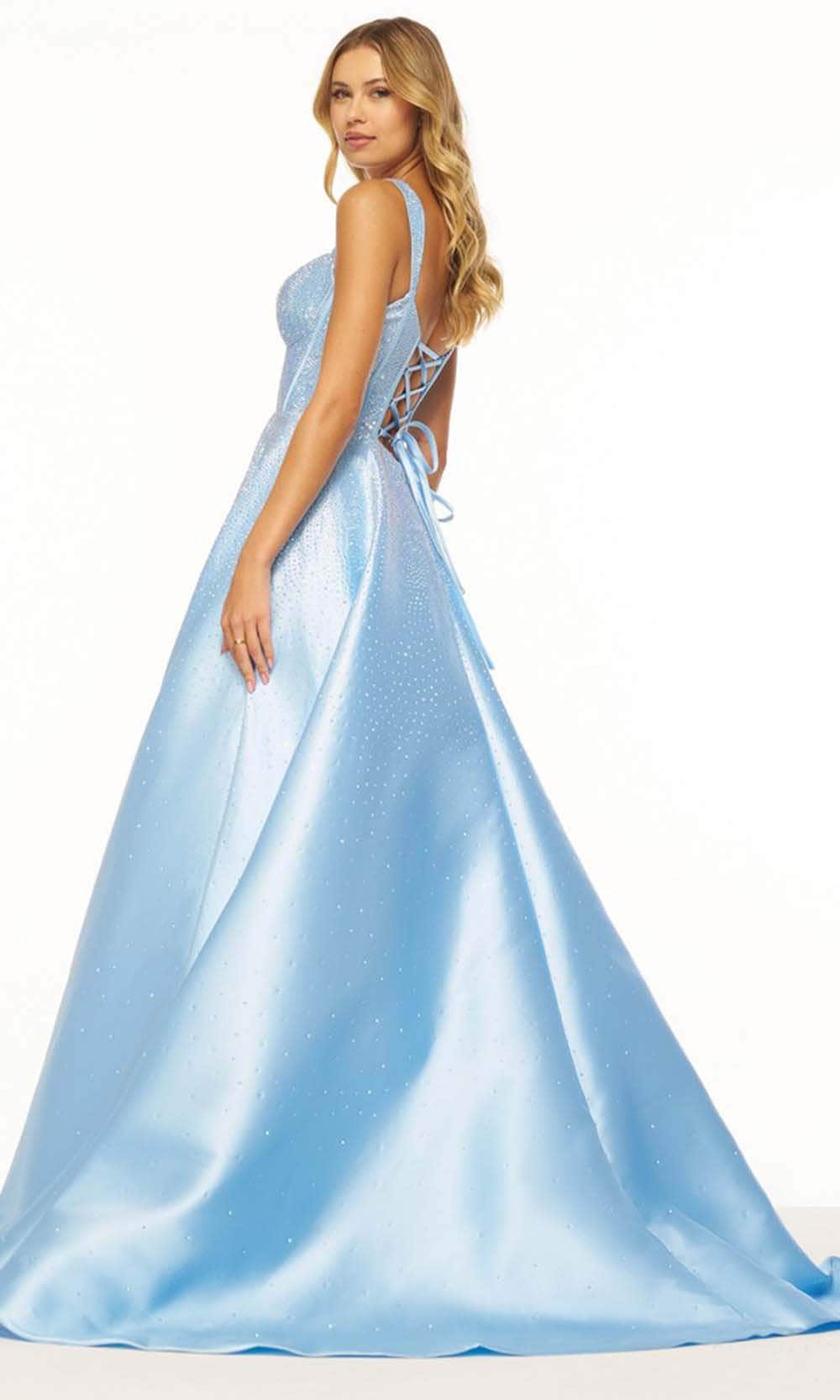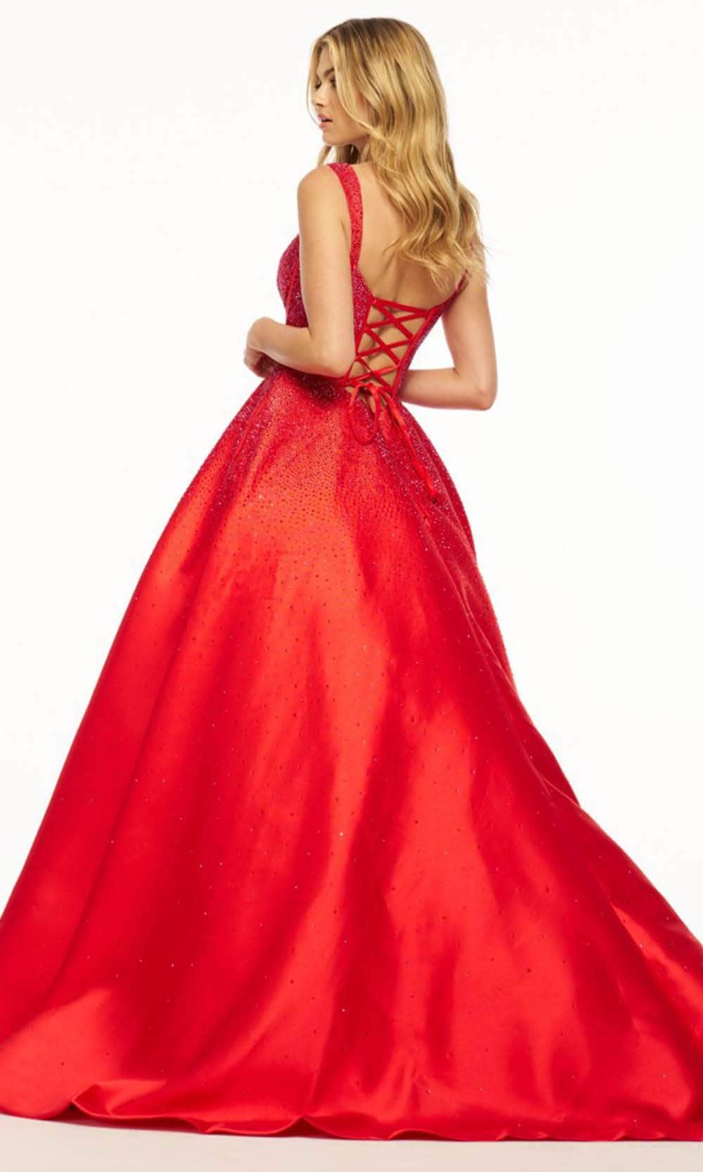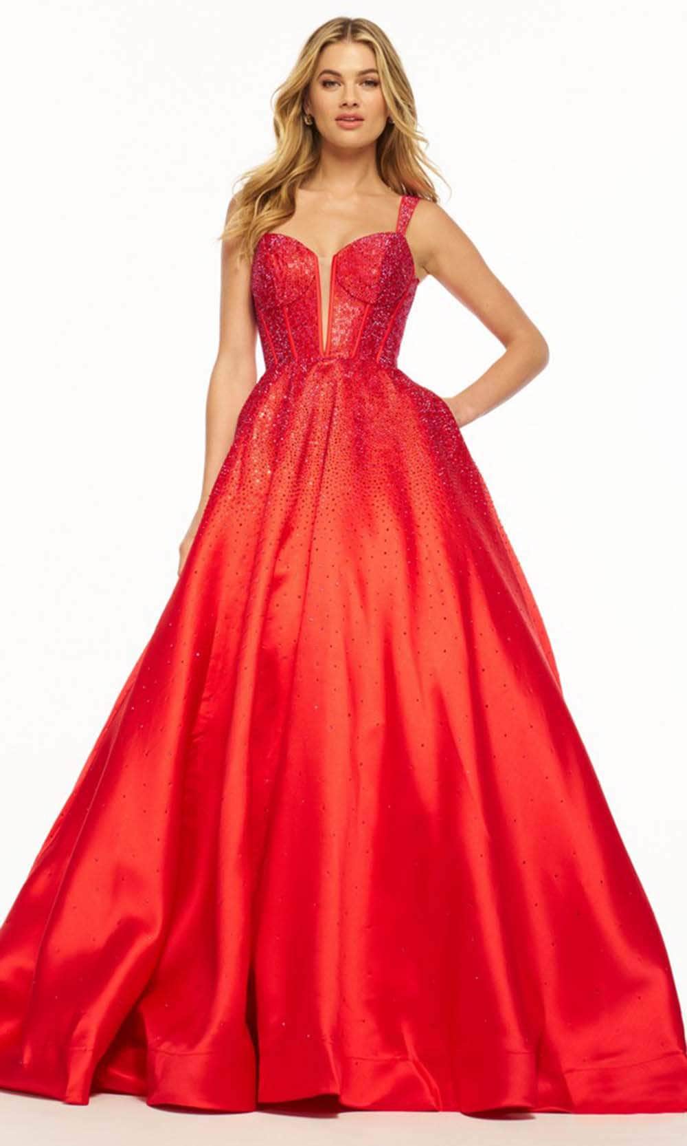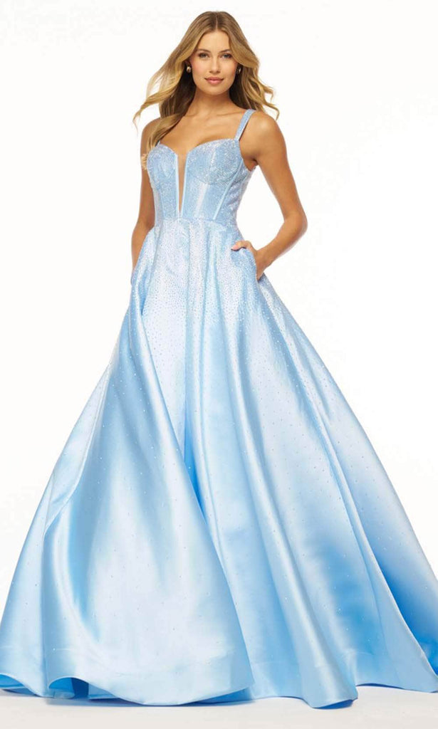 Sherri Hill 56106 is an enchanting Mikado ball gown that exudes elegance and charm. The sleeveless corset bodice is adorned with hotfix embellishments, creating a dazzling effect. The deep V illusion neckline adds a touch of allure, while the crochet-style lace-up back enhances the gown's romantic appeal. Side pockets at the floor-length skirt add a modern and practical touch. The dress concludes with a train, making it a perfect choice for those seeking a harmonious blend of classic style and contemporary detailing. Sherri Hill 56106 ensures a standout presence at any special occasion. Models are wearing Light Blue and Red colors.