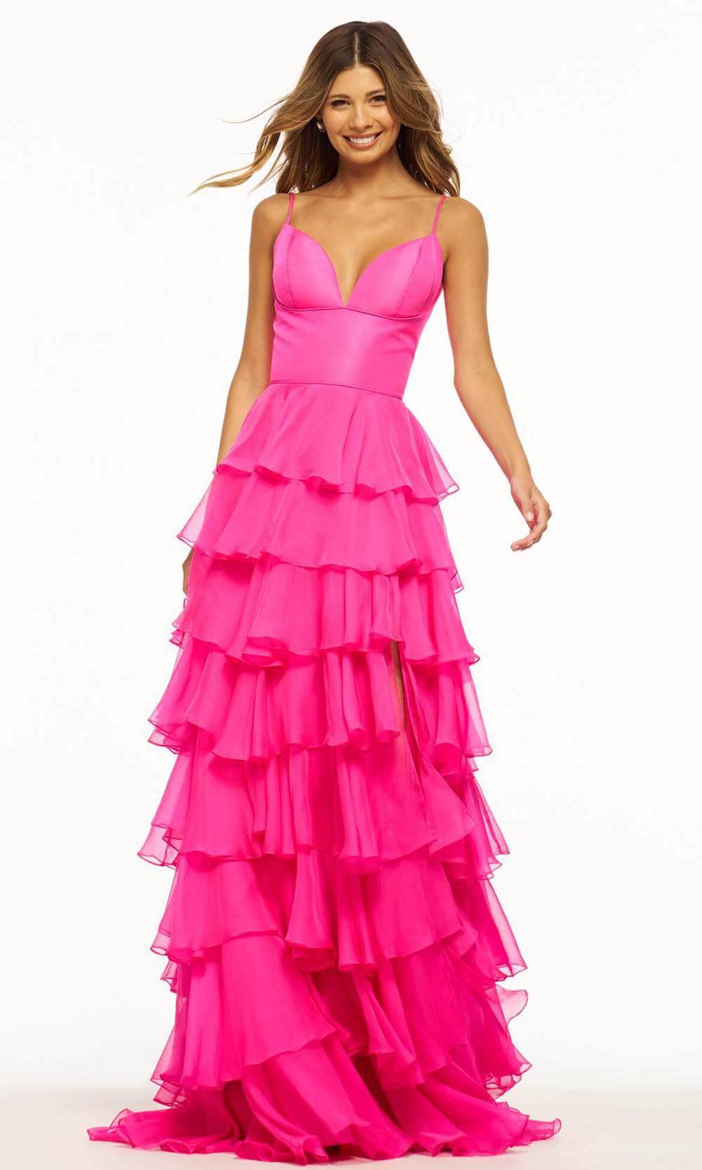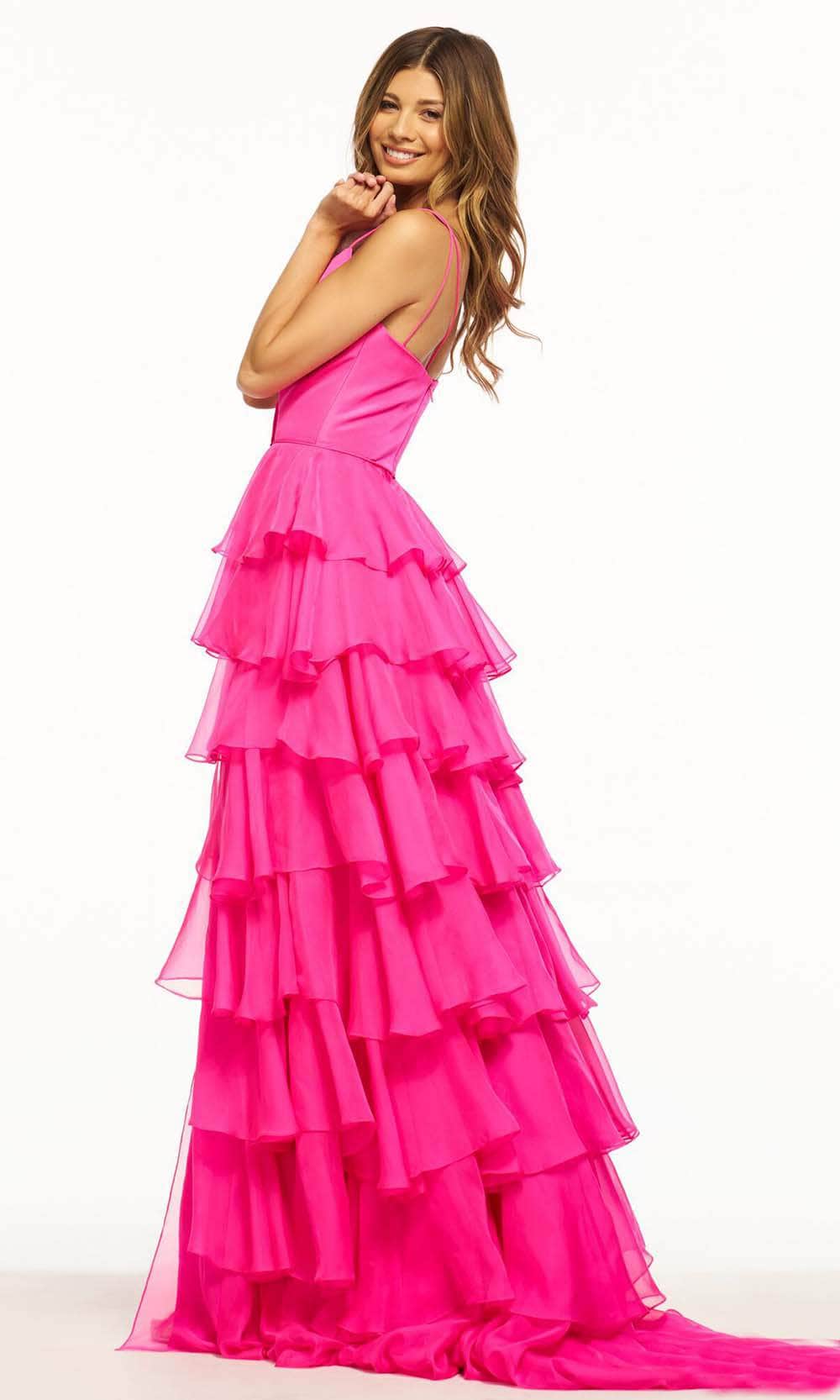 Experience timeless elegance in this graceful Sherri Hill 56108 gown with spaghetti straps and a V-neckline. The strappy midrise back, coupled with a concealed zipper closure, ensures both style and ease of wear. The tiered ruffled skirt adds a touch of sophistication and movement to the ensemble, while a high slit infuses a modern edge. Completing the look is a sweeping train that imparts a sense of refinement and grace to this beautifully tailored gown. Ideal for those who appreciate understated elegance and style, this dress is a tasteful choice for various formal occasions. Make a memorable entrance with this timeless and chic Sherri Hill 56108 gown. Models are wearing the Bright Pink and Yellow colors.