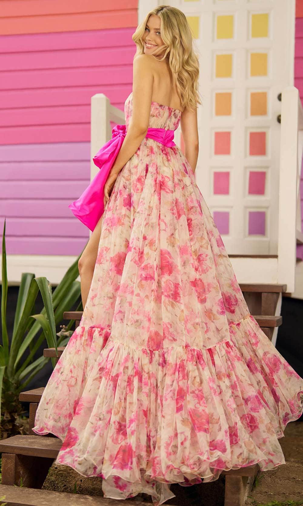 Step into the spotlight with this graceful Sherri Hill 56110 gown crafted from floral print organza. Its tailored silhouette exudes an understated elegance, while the strapless design and sweetheart neckline on the shirred bodice create a classic and timeless look. The taffeta bow adds a subtle but charming detail to the ensemble. With a midrise back featuring a concealed zipper closure, practicality meets style. The A-line skirt adds a touch of sophistication with a high slit, allowing for ease of movement and a hint of allure. Completing the attire is a sweeping train, which adds a sense of refinement to the overall design. This Sherri Hill 56110 gown is ideal for those seeking a tasteful and elegant look for their special occasion. Model is wearing the Hot Pink/Yellow color.