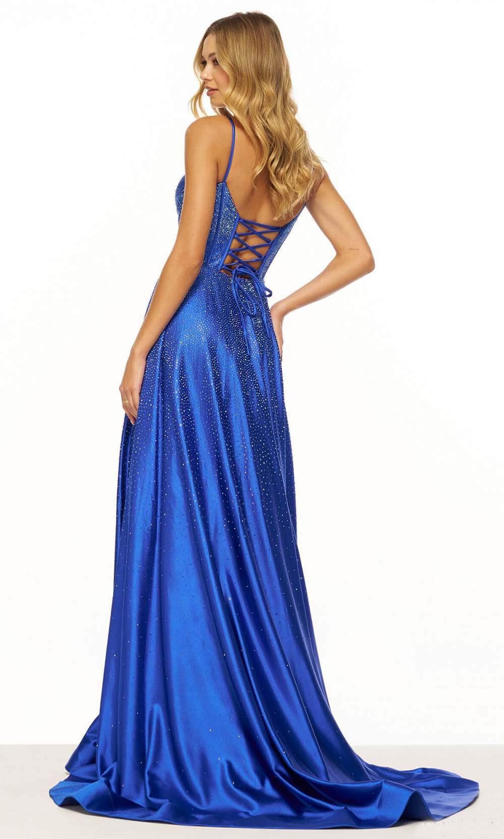 Be the lady of the night in this Sherri Hill 56190 is a mesmerizing hot-fix A-line gown, epitomizing modern glamour. The corset bodice, adorned with intricate hot-fix embellishments, exudes luxury. The lace-up back ensures a perfect fit, adding a touch of allure. The floor-length A-line skirt gracefully parades, accentuating the gown's classic charm. A high slit infuses a hint of drama, allowing for graceful movement, and the ensemble concludes with a luxurious train. This Sherri Hill 56190 is a captivating choice for those seeking a seamless blend of sophistication and contemporary allure. Model is wearing Royal color.