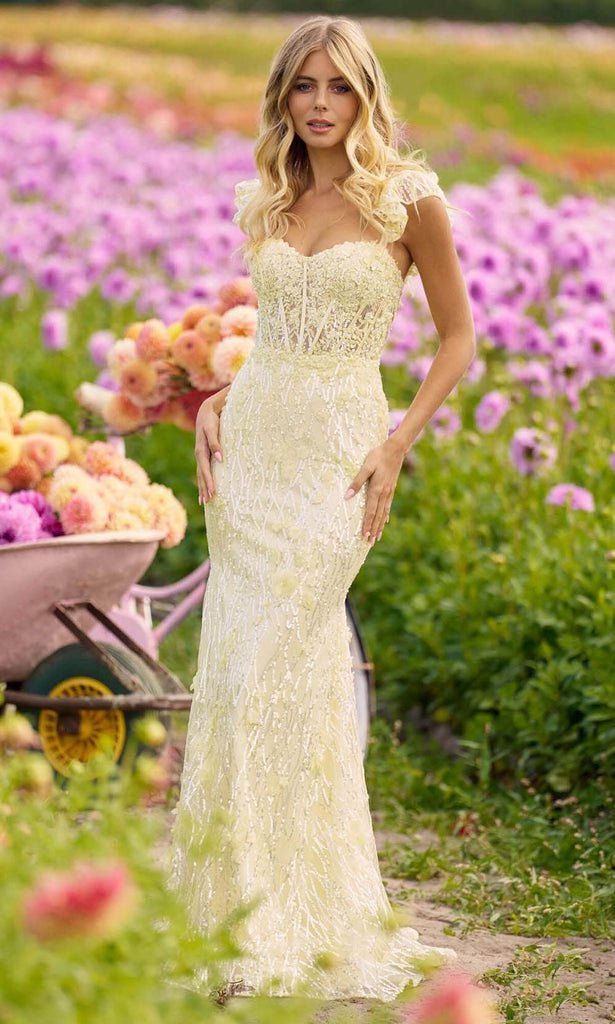 Embody the spirit of romance in this dreamy Sherri Hill 56209 gown, a vision of lace, tulle, and timeless elegance. This gown showcases an allover embellished design, creating a stunning and intricate look. It features a fitted silhouette that accentuates the figure gracefully. The ruffle sleeves add a touch of elegance and style to the ensemble. The sweetheart neckline and lace appliques adorned with rhinestones bring a classic and timeless charm to the dress. With a sheer corset bodice and a lace-up back, it combines allure with a structured design. The mermaid skirt follows the body's contours, and a sweeping train completes the attire with a sense of sophistication. Elevate your red-carpet moment with this glamorous Sherri Hill 56209 gown. Model is wearing the Light Yellow color.
