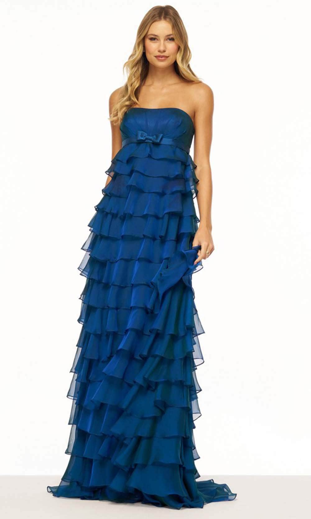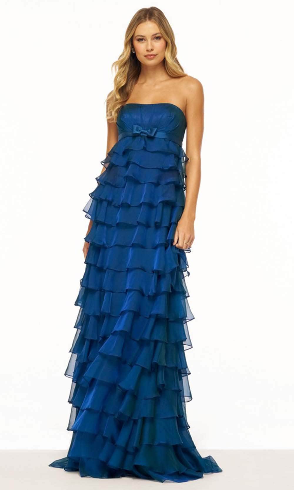 Get the attention of everyone in this Sherri Hill 56226, a vision of timeless elegance in a strapless gown. The straight-across neckline offers a classic touch, while a gracefully placed bow embellishment cinches the empire waistline, adding a hint of charm. The floor-length ruffle skirt cascades with effortless grace and concludes with a train, creating a sense of movement and drama. This Sherri Hill 56226 is a harmonious blend of classic style and contemporary allure, making a statement on any special occasion with its refined silhouette and delicate detailing. Model is wearing Navy color.