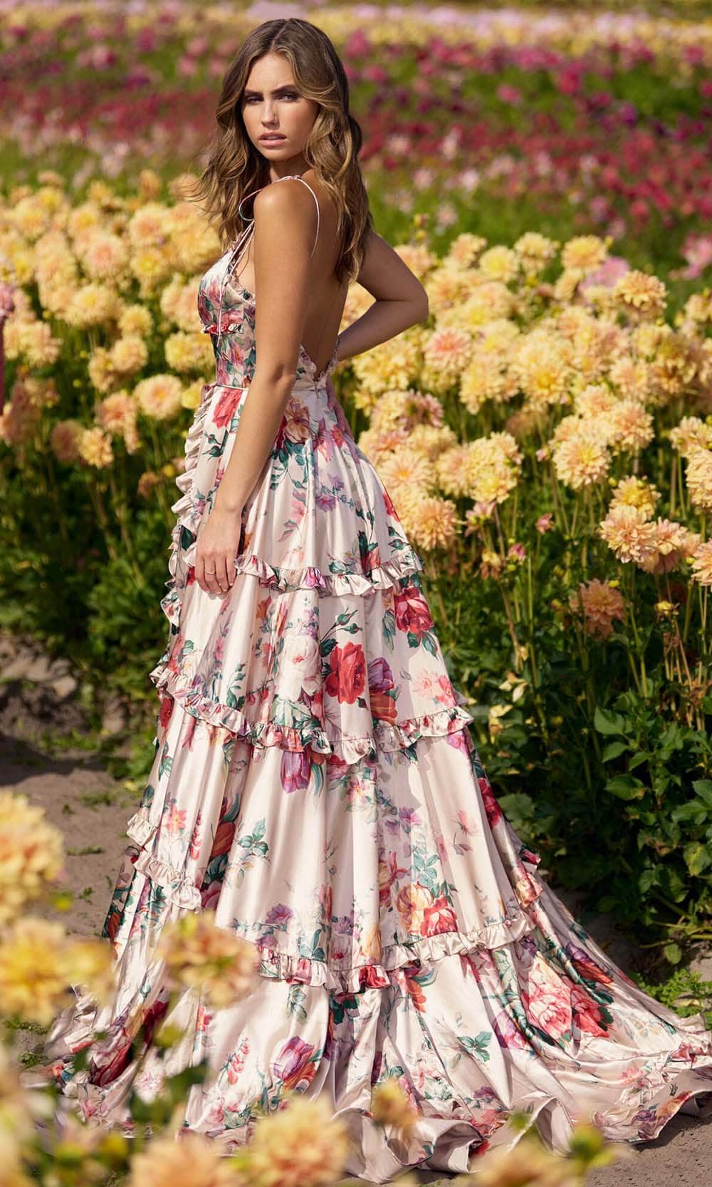 Charm everyone with the beauty and style of this Sherri Hill 56256 creation. This gown embodies a refreshing simplicity with its floral print satin fabric and thoughtful design. The bow tie strap introduces a touch of playfulness to the ensemble, while the V-neckline, adorned with subtle ruffle trims, adds a hint of charm. The low V-open back, discreetly fastened with a concealed zipper closure, maintains an understated elegance. The ruffle ornate skirt, featuring a high slit, contributes a dynamic element to the silhouette, and the ensemble is gracefully completed with a sweep train. Lavish in the pure romance and beauty of this Sherri Hill 56256 masterpiece. Model is wearing the Champagne Print color.