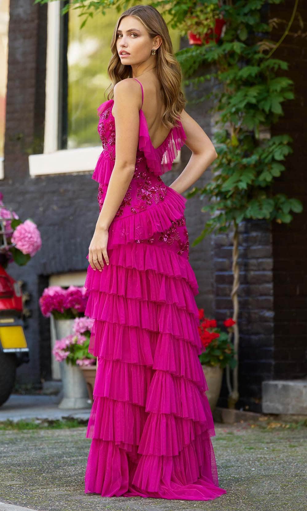 Steal the spotlight and shine brightly with this regal Sherri Hill 56310 creation. This gown features intricate floral 3D beading throughout, with multiple layers of ruffle trim adding dimension and charm. Spaghetti straps lead to a V-neckline that exudes elegance, while the V-open back creates a striking yet tasteful detail. The concealed zipper closure ensures a seamless look. The sheath skirt boasts ruffles and a high slit for both movement and a hint of allure. Completing the ensemble is a graceful sweep train, adding a touch of timeless sophistication. Command attention and admiration and be the show-stopper in this Sherri Hill 56310 masterpiece. Model is wearing the Fuchsia color.