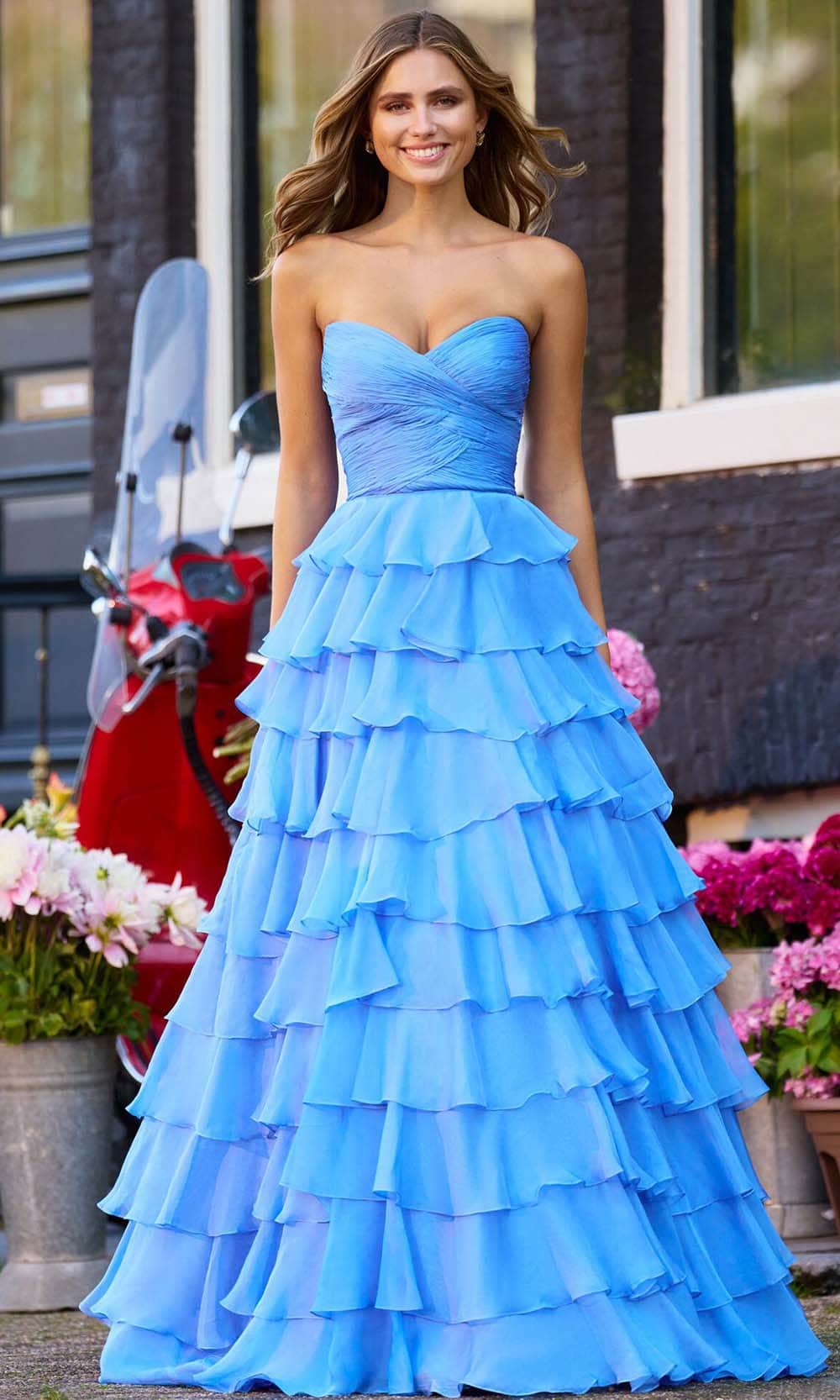 | Details: | Fitted, Sleeveless, Strapless, Ruched, Tiered, Ruffled Skirt, Mid-Open Back, Back Zipper, Floor Length |