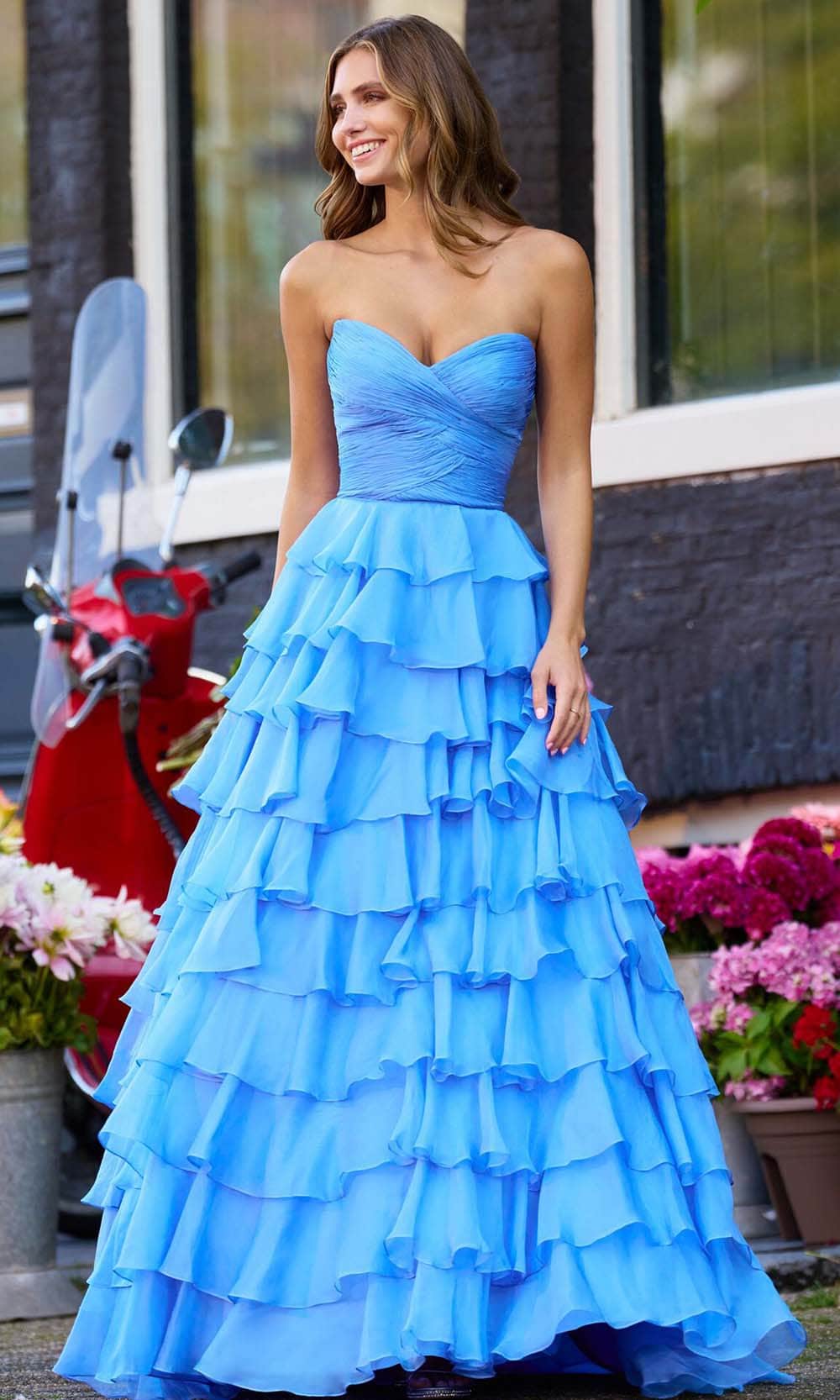 Enchant onlookers as you dazzle in the captivating Sherri Hill 56346 prom dress. Elevating your allure, this dress features a captivating strapless sweetheart neckline atop a figure-enhancing ruched bodice. Secured by a zipper, the mid-open back adds a touch of sophistication. The tiered, ruffled A-line skirt enhances the overall appeal. Prepare to captivate the crowd in this exceptional Sherri Hill 56346 masterpiece, leaving a trail of admirers in your wake. Model is wearing Peacock color.