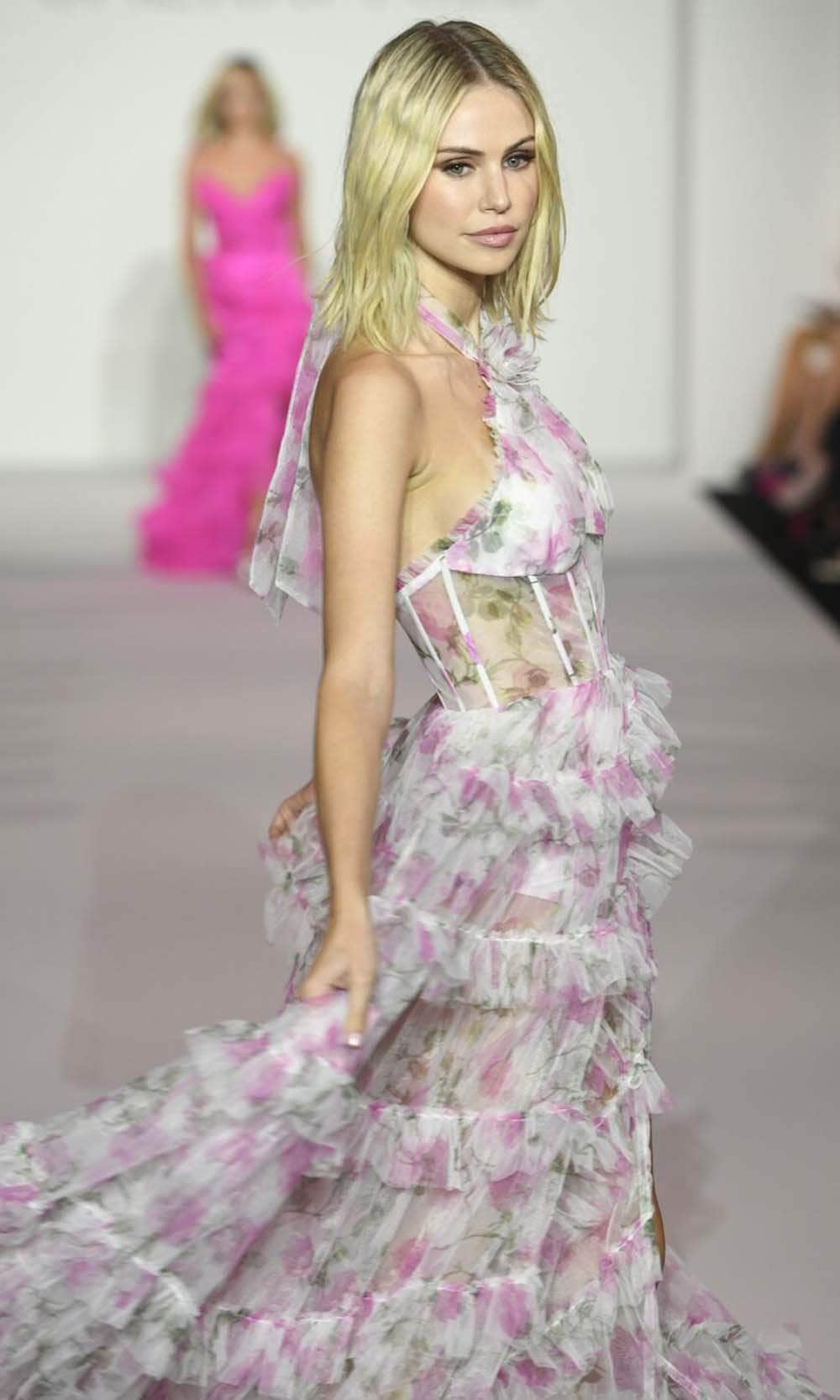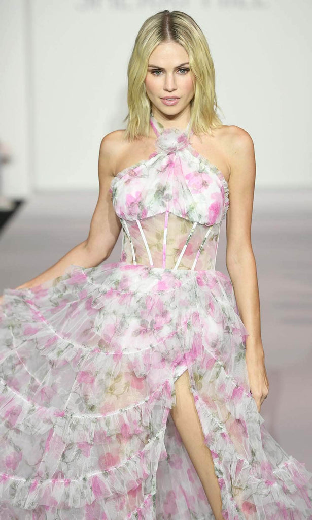 Elegant and statuesque, the Sherri Hill 56377 prom dress exudes luxurious style, perfectly complementing your refined demeanor for the evening. With a charming ruffled halter neckline adorning a fitted, corset bodice, this dress boasts an empire waistline and a floral accent at the neck for an extra touch of glamour. The entirely floral-designed ensemble features a high slit on the A-line skirt, accompanied by a majestic court train that gracefully cascades to the floor. Embrace the celebration of your beauty in the sophisticated masterpiece that is Sherri Hill 56377! Model is wearing Rose/Pink color.