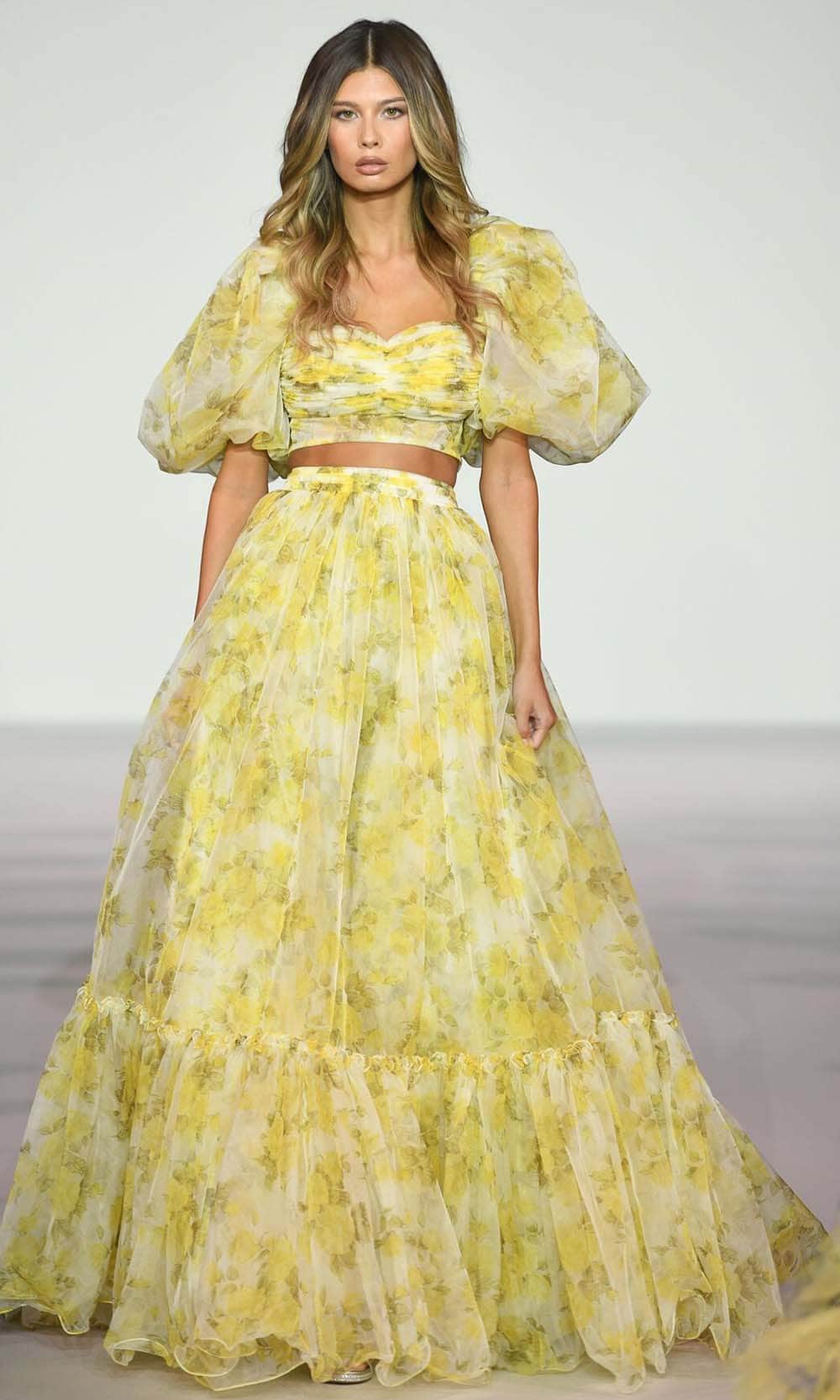 Radiate charm in this ethereal Sherri Hill 56378 gown, a vision of beauty that transcends time and trends. This two-piece gown features a striking floral print on a tulle fabric, offering a fresh and vibrant look. The top showcases balloon sleeves and a sweetheart neckline with a shirred bust, providing a touch of charm and comfort. The mid-open back is secured with a tie strap and concealed zipper closure for easy wear. The A-line skirt is elegantly designed with a paneled hem, adding a subtle sense of style, while a sweep train completes the ensemble with a hint of sophistication. Unleash your inner enchantress in this bewitching Sherri Hill 56378 gown. Model is wearing the Yellow Rose color.