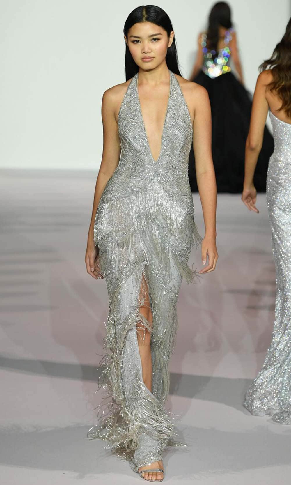 | Details: | Sleeveless, Plunging V-Neck, Beaded, Fringes, Backless, Back Zipper, Front Slit, Sweep Train, Fitted |