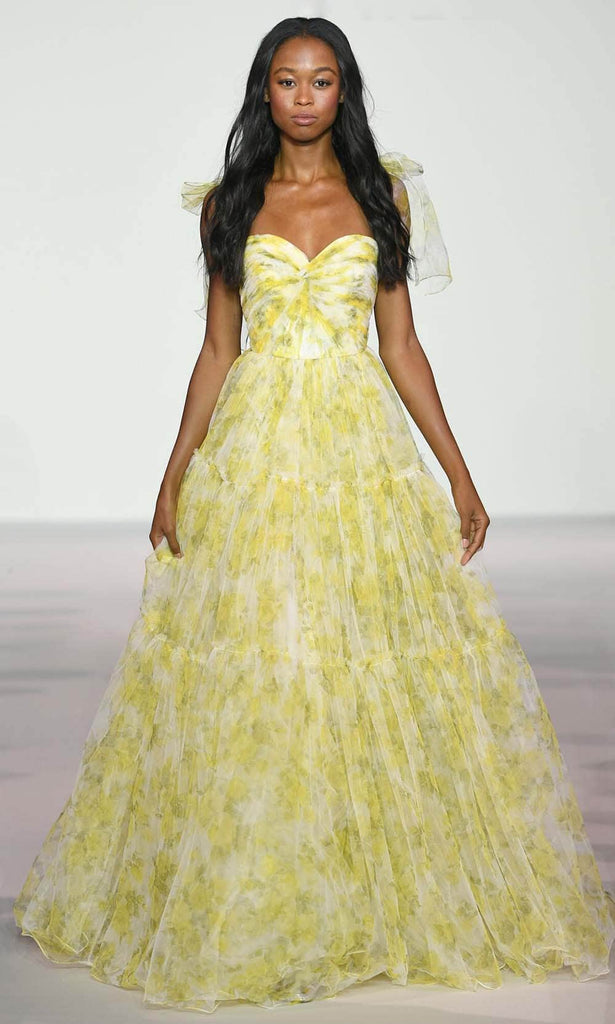 | Details: | Floral Print, Bow Tie Sleeve, Shirred Bodice, Midrise Back, Concealed Zipper Closure, Paneled Skirt, Sweep Train |