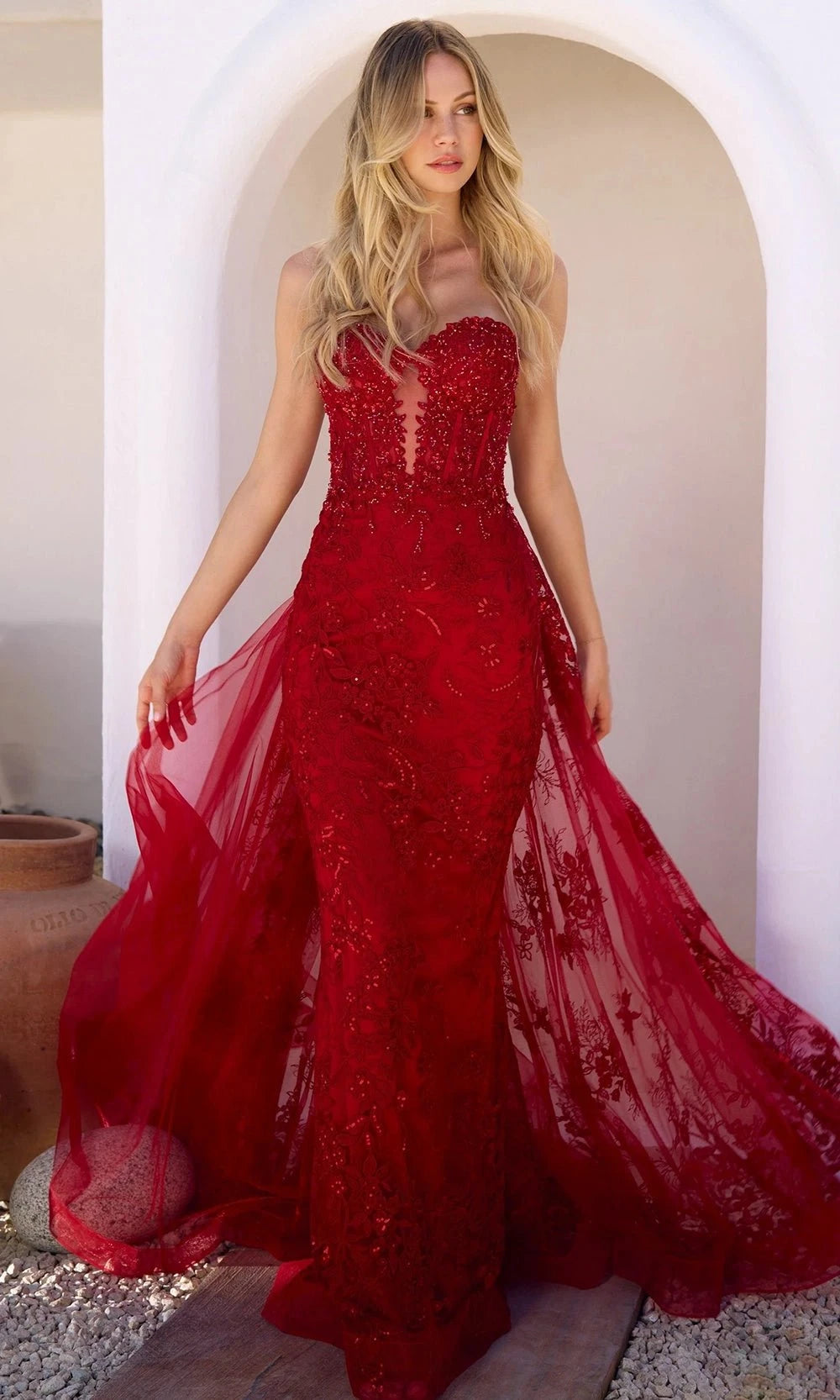 Step into the spotlight with the enchanting Sherri Hill 56670, a gown that epitomizes luxury and charm. The sweetheart neckline and strapless design sets the stage for an alluring look, beautifully complemented by intricate beaded and embroidery embellishments that shimmer from every angle. The sheath skirt has overskirt that cascades gracefully, adding drama and movement to this masterpiece. Perfect for a grand entrance, the Sherri Hill 56670 is a show-stopping choice for any formal affair. Model is wearing Red color.