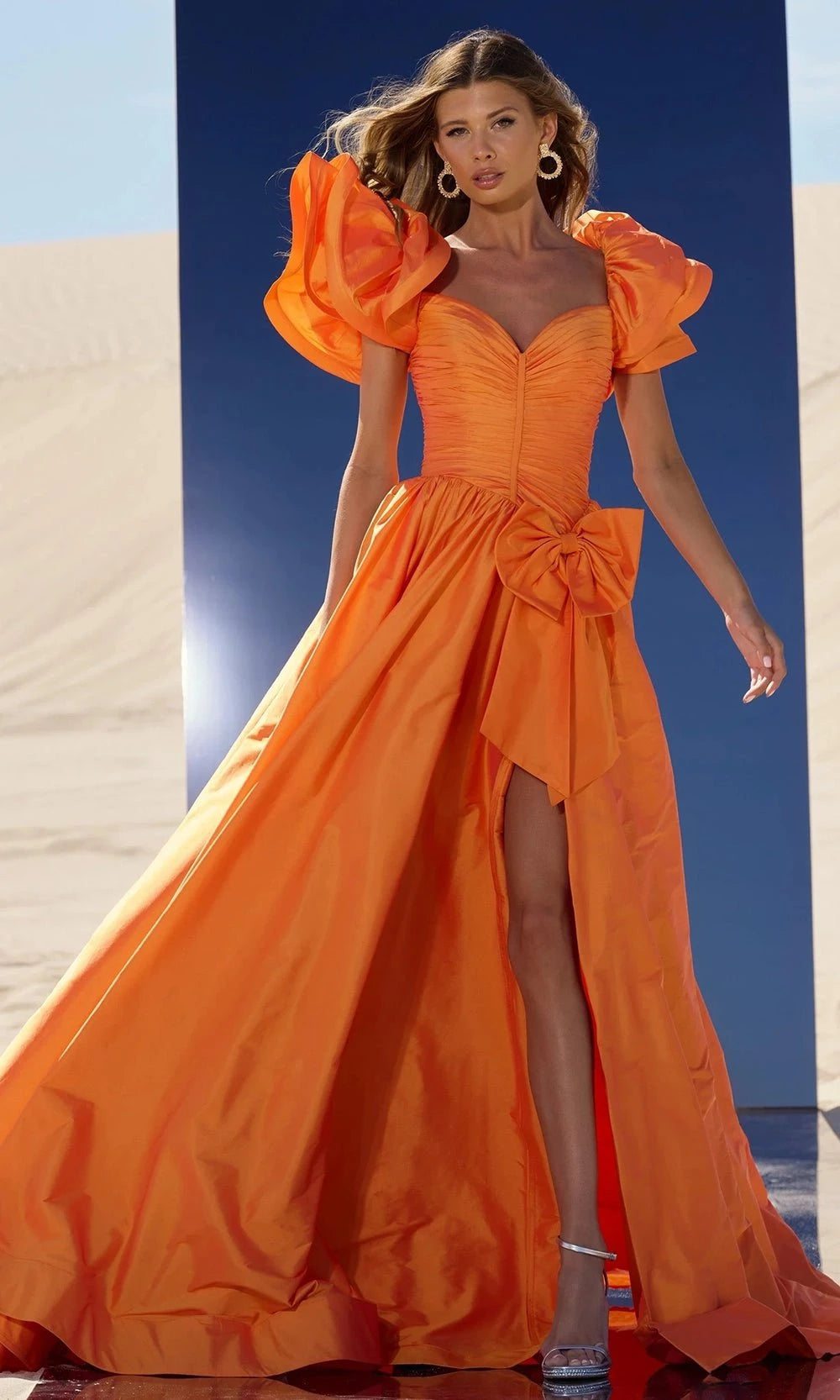 Step into the spotlight with the Sherri Hill 56743, an extravagant taffeta gown that exudes drama and romance. The ruched bodice is complemented by oversized puff sleeves, adding a regal touch to the silhouette. A striking bow detail cinches the waist before cascading into a A-line skirt with a daring thigh-high slit, ensuring effortless movement and elegance. Whether for a grand ball or an elite gala, the Sherri Hill 56743 is your ultimate statement piece. Model is wearing Light Orange color.