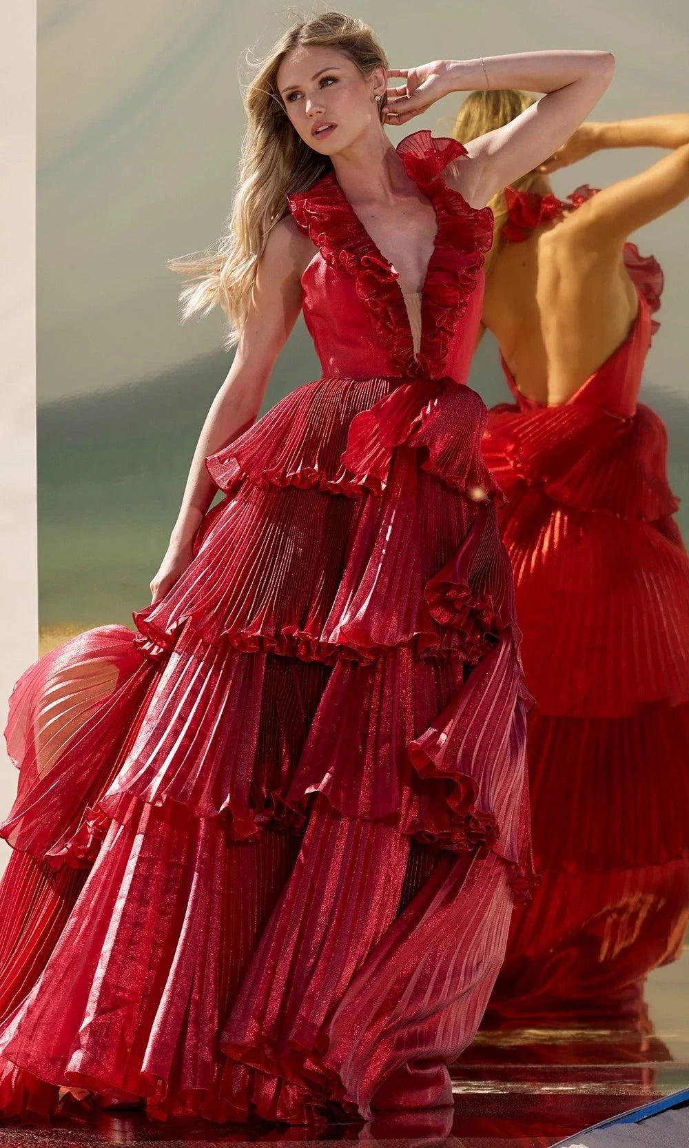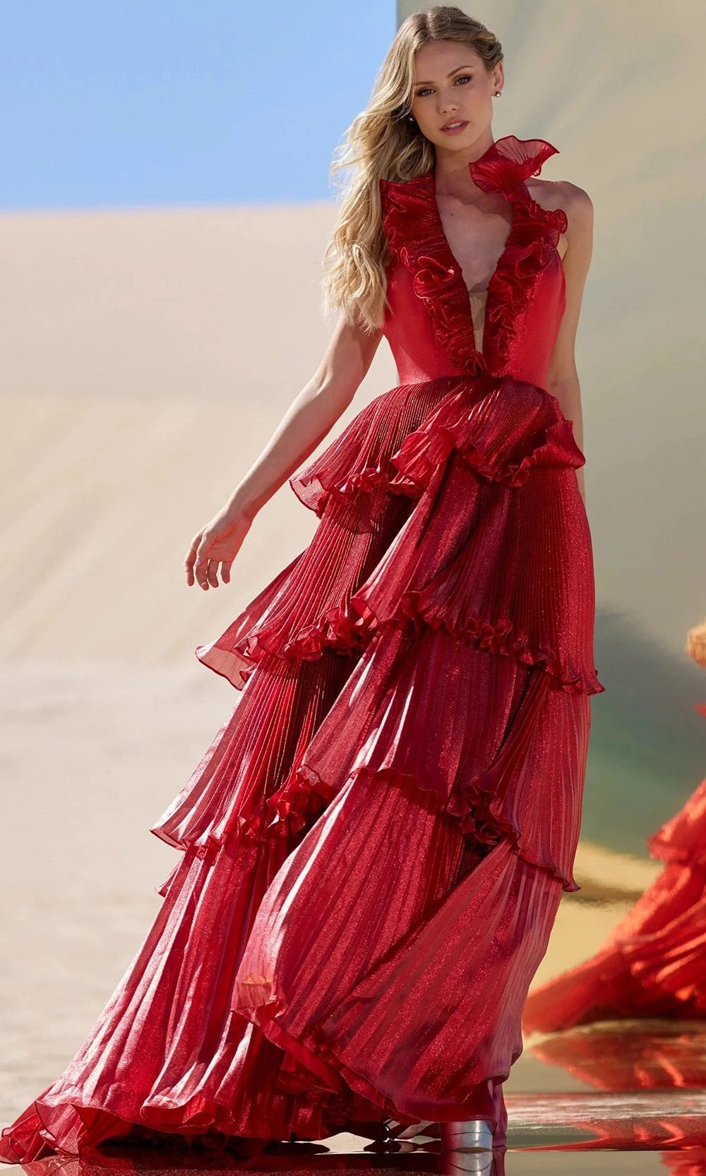 Command attention in the Sherri Hill 56801, a mesmerizing sleeveless gown featuring pleated glitter organza in a textured design. The halter-style plunging V-neckline is framed by dramatic ruffles, exuding femininity and bold style. An open design in the back reveals a glance of your skin, while the voluminous layered detailing in the A-line skirt adds movement and dramatic flair. Embrace timeless sophistication with the Sherri Hill 56801 gown, perfect for grand celebrations. Model is wearing Red color.