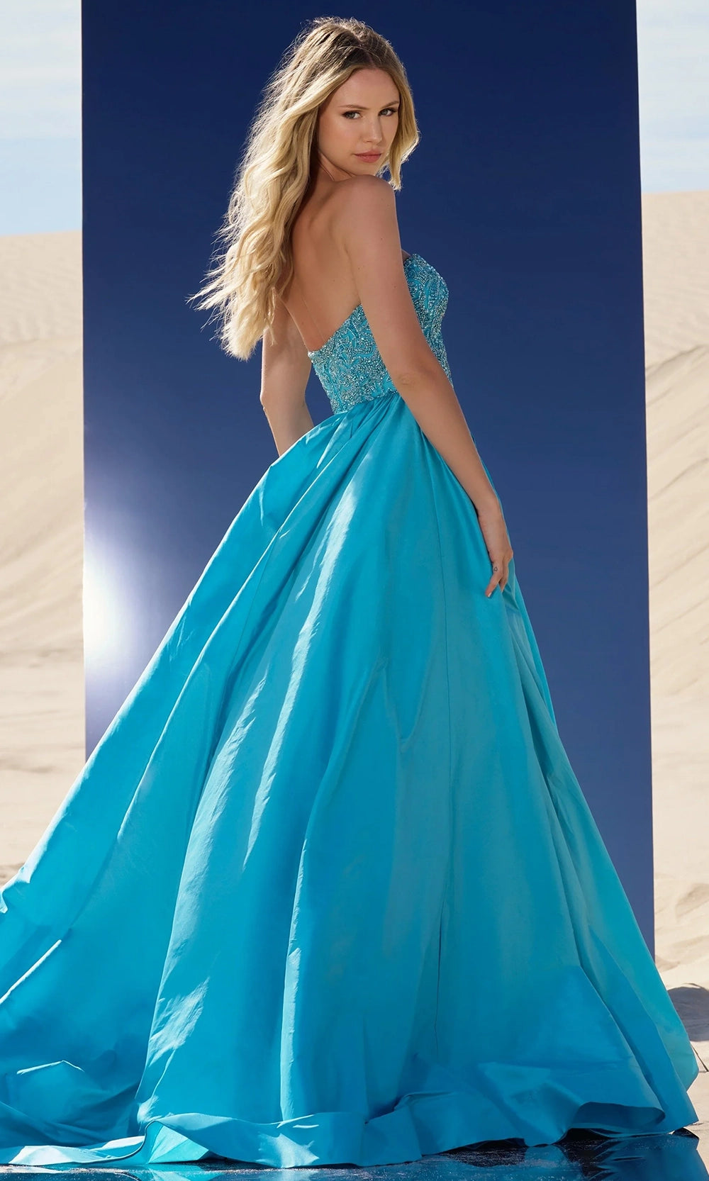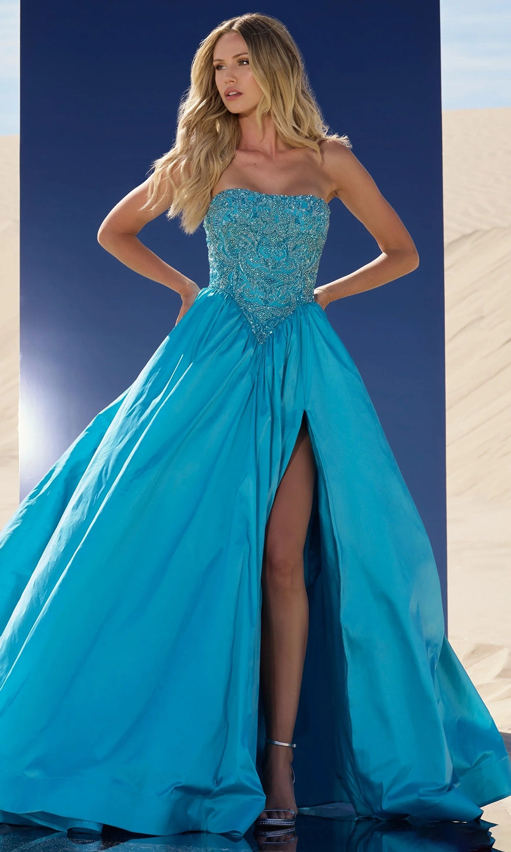 Glowing with a mix of elegance and bold charm, this Sherri Hill 56830 strapless masterpiece features a richly embellished bodice that draws all attention upward. The sweetheart neckline softens the silhouette while the beaded detailing creates a luxurious texture. The flowing ballgown skirt opens into a daring thigh-high slit, offering a dramatic flair. This style seamlessly combines intricate craftsmanship with graceful movement, making it an unforgettable choice. Every detail in Sherri Hill 56830 reflects timeless sophistication blended with striking modern accents. Model is wearing Aqua color.