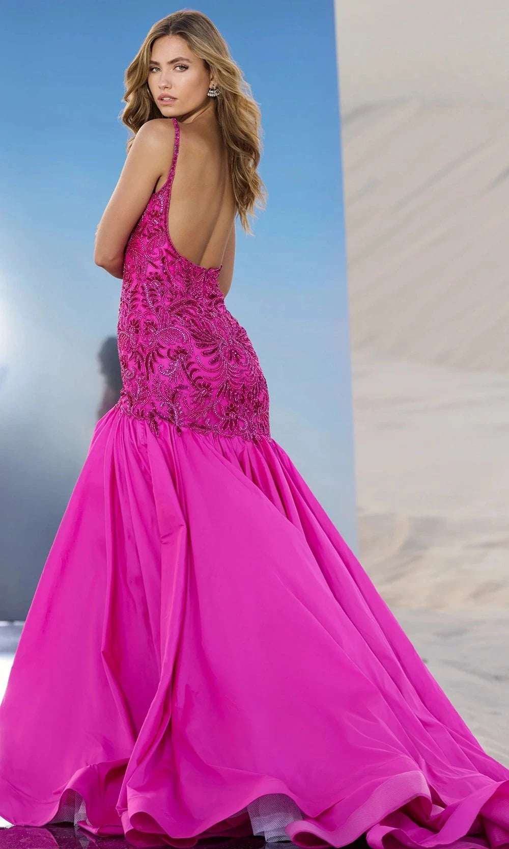 Steal the spotlight in the Sherri Hill 56831, a striking gown designed for glamorous, statement-making occasions. Adorned with intricate floral beadwork, the fitted bodice sparkles with every movement. The trumpet skirt crafts a graceful, contouring fit for a striking effect. Delicate spaghetti straps lead to a scoop neckline, while the scoop back and sweep train adds drama to this captivating design. The high slit enhances allure, ensuring a striking presence at any event. Leave everyone speechless when you enter the room in this Sherri Hill 56831 style. Model is wearing Bright Fuchsia color.
