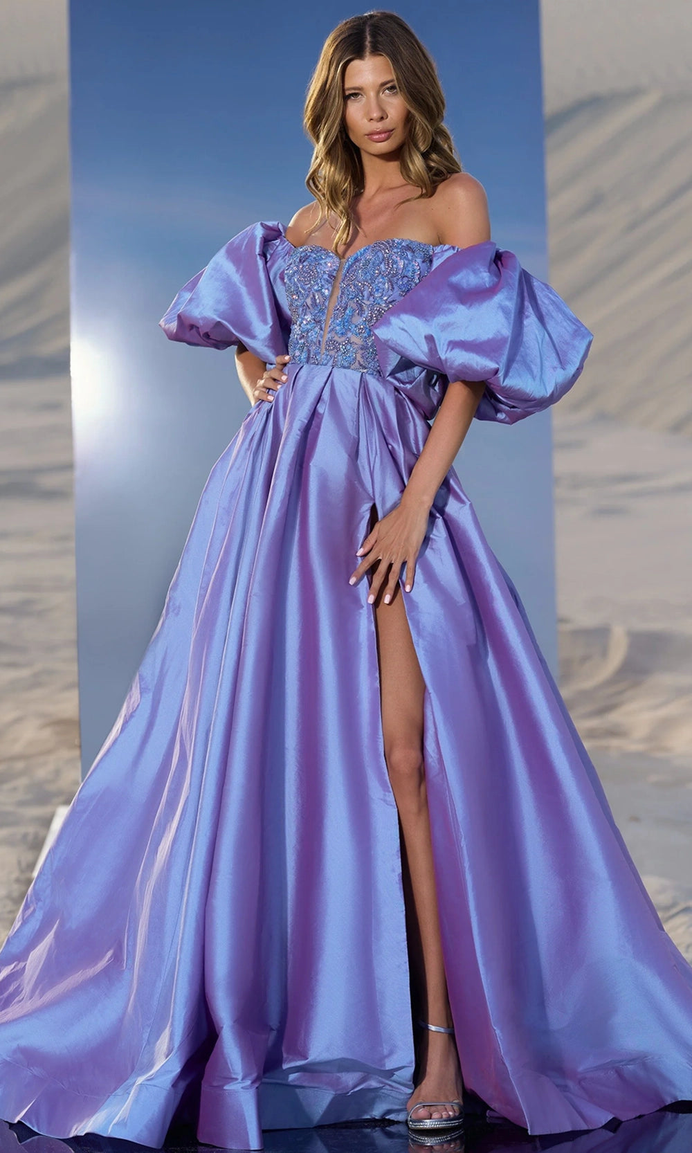 Sherri Hill 56843 blends timeless poise with graceful movement, creating a look that is effortlessly captivating from every angle. The dramatic off-shoulder puff sleeves and shimmering beaded top, paired with a romantic sweetheart neckline, give this gown undeniable presence. The box pleated ballgown skirt adds depth while the high slit adds just the right touch of allure, balancing poise and glamour. Whether gracing a formal venue or celebrating a once in a lifetime moment, Sherri Hill 56843 brings luxury and drama to life. Model is wearing Periwinkle color.