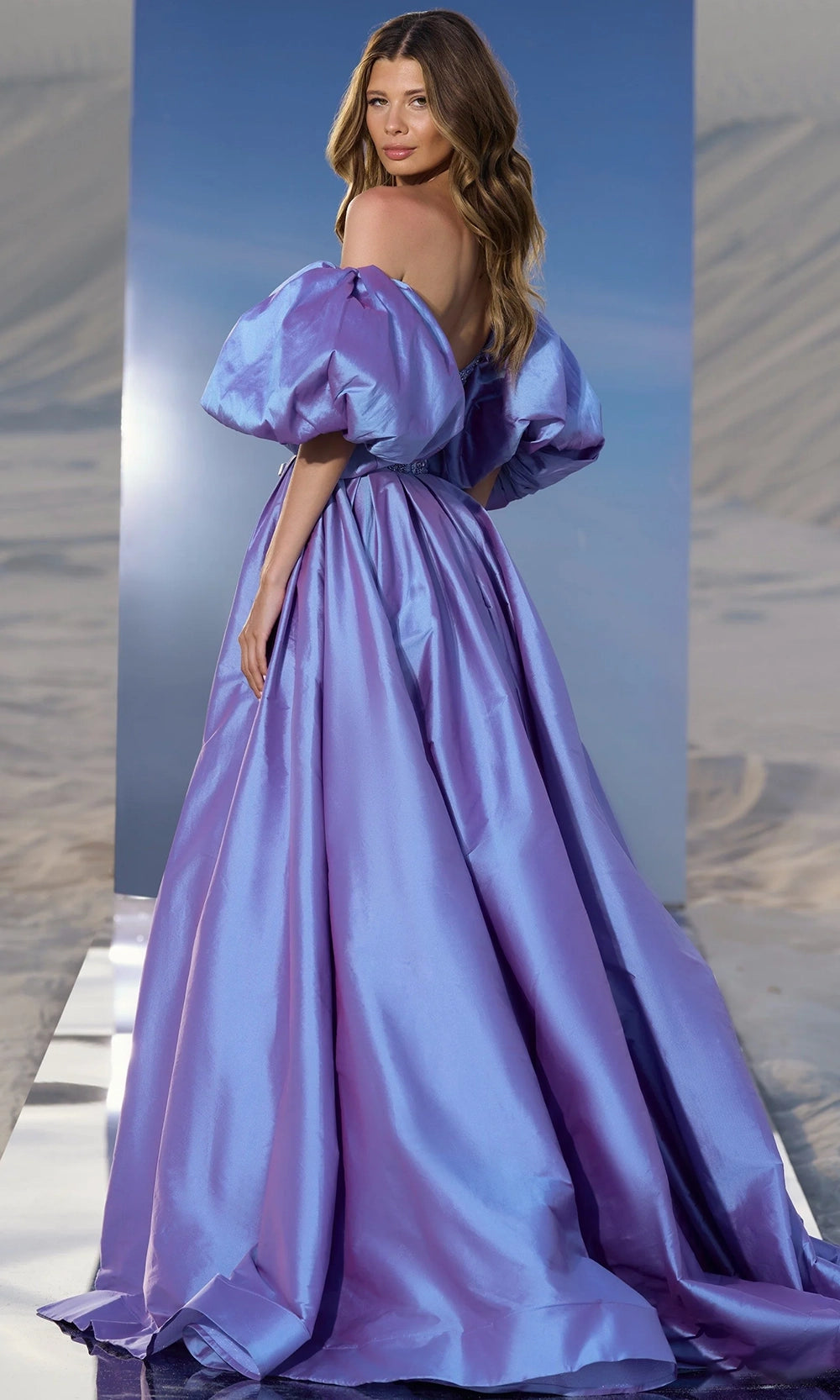| Details: | Off Shoulder Puff Sleeves, Beaded, High Slit, Pleated Skirt, Open Back, Sweep Train |
